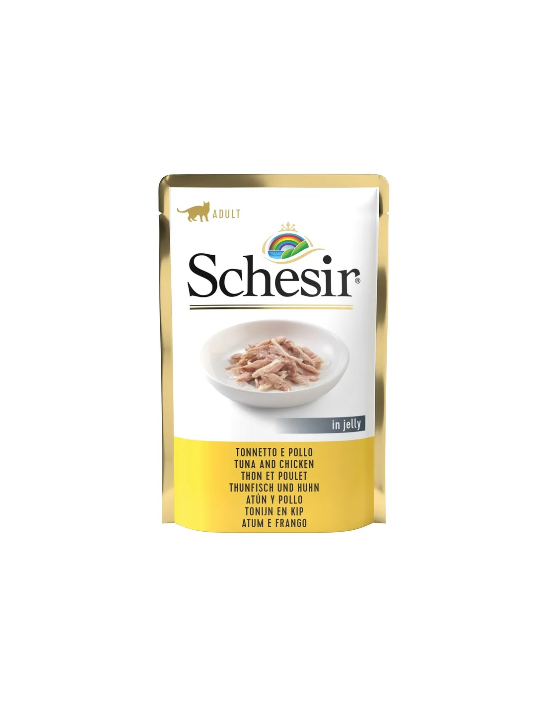 La composition de la nourriture humide Schesir pour chat a été conçue pour offrir un repas complet et équilibré. Le thon représente 55 % de la recette, apportant une riche source de protéines et d'acides gras essentiels. Le poulet, présent à hauteur de 5 %, ajoute de la variété et des protéines supplémentaires de haute qualité. Le riz, inclus à hauteur de 1,5%, est une source de glucides facilement digestibles qui apportent de l'énergie. La gélatine améliore non seulement la texture, mais contribue également à l'apport d'humidité nécessaire à la santé rénale du chat.