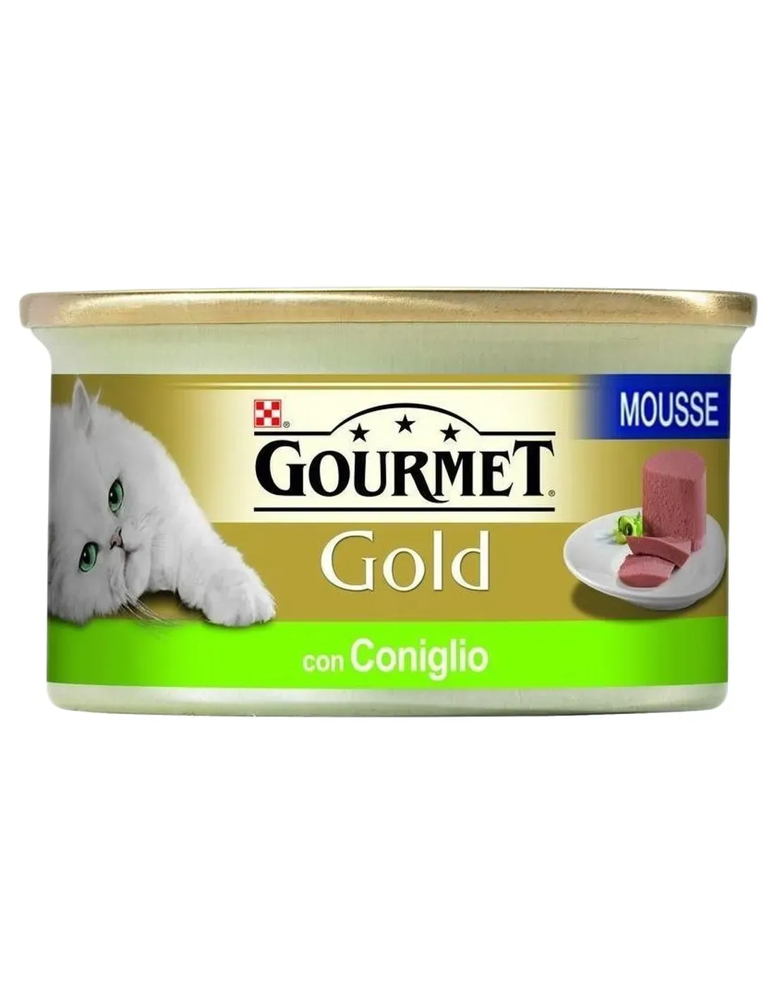 Mousse dorée gourmande au lapin 85 gr, mousse très tendre à la viande ou au poisson soigneusement préparée pour offrir à votre chat le plaisir d'une sensation douce et délicate.