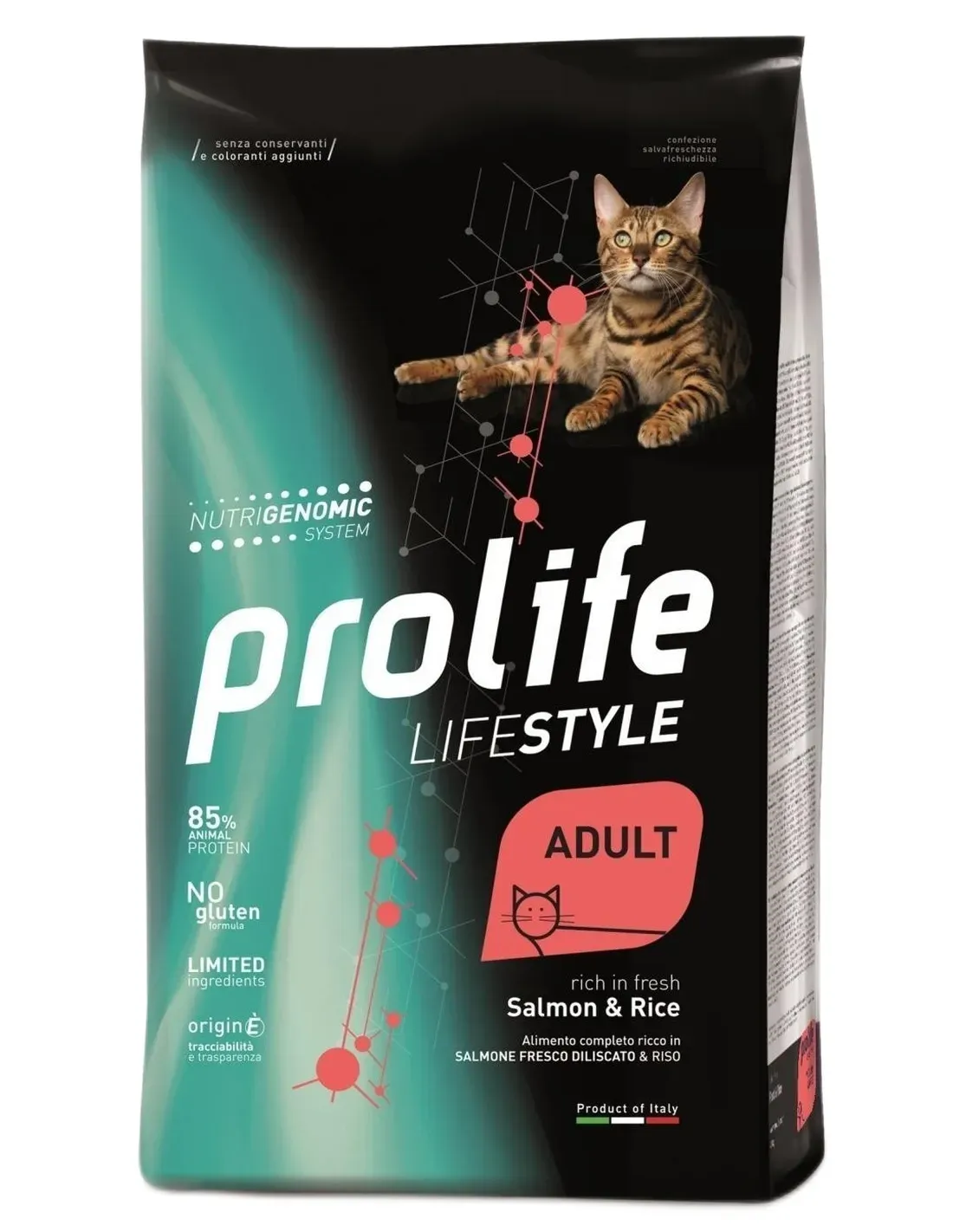 Prolife Lifestyle Adult Saumon et Riz est un aliment complet riche en saumon frais désossé et en riz, pour chats adultes. Lifestyle est une mini ligne de solutions nutritionnelles riches en poulet frais ou poisson frais pour répondre avec goût aux besoins des chatons et chats adultes.