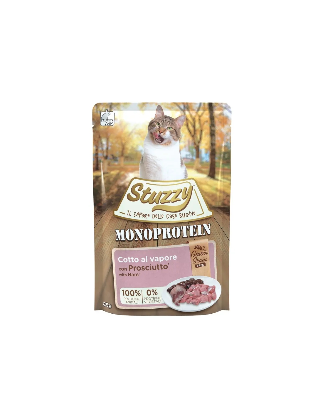 "Stuzzy Monoprotein with Ham" est une nourriture humide pour chats adultes qui se distingue par sa formule monoprotéique, à base exclusivement de jambon de haute qualité comme seule source de protéines animales. Ce produit a été développé pour répondre aux besoins nutritionnels des chats, notamment ceux présentant des sensibilités alimentaires ou suivant un régime d'exclusion. La cuisson à la vapeur préserve les arômes naturels et la fraîcheur des ingrédients, faisant de chaque repas un repas délicieux et nutritif.