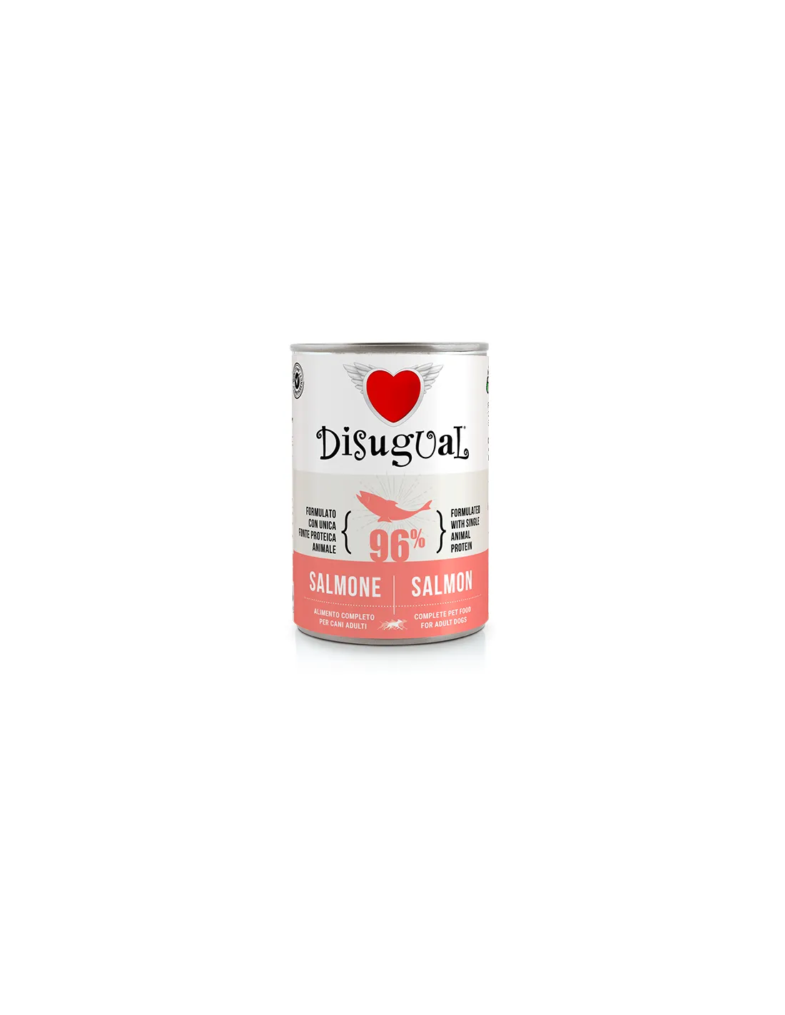 Le produit "Adult Dogs Disugual Wet Dog Saumon 400 Gr" est un aliment humide complet pour chiens adultes. Il est formulé avec une seule source de protéines animales, le saumon, qui représente 96 % du produit. Les 4% restants sont constitués de gélatines végétales, de vitamines et de sels minéraux. Il ne contient pas de conservateurs, colorants ou arômes artificiels. C'est un produit sans gluten et sans céréales, fabriqué en Italie avec des matières premières sélectionnées. Chaque paquet a un format de 400g.