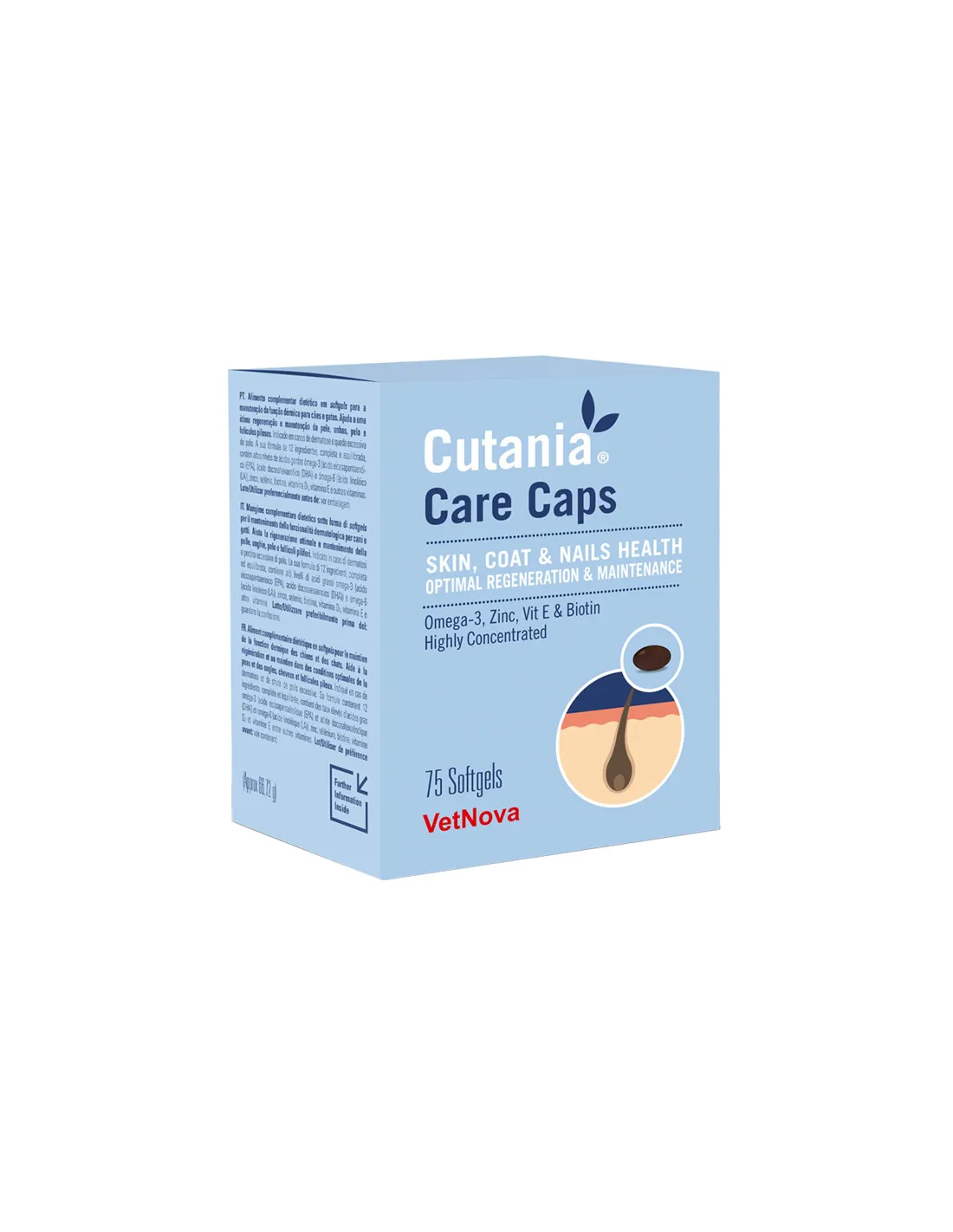 CUTANIA® Care Caps est un complément alimentaire dermatologique en capsules molles, créé pour soutenir la santé de la peau et du pelage des chiens et des chats. Ce produit est une formule complète et équilibrée qui fournit une combinaison synergique de 12 ingrédients essentiels, dont des acides gras oméga-3, oméga-6 et oméga-9, des vitamines et des minéraux. La présence de biotine, de zinc et de sélénium contribue au maintien d'une peau saine et d'un pelage brillant et fort. L'emballage contient 75 gélules, chacune formulée pour apporter un soutien nutritionnel ciblé et de haute qualité pour le bien-être dermatologique de vos animaux.