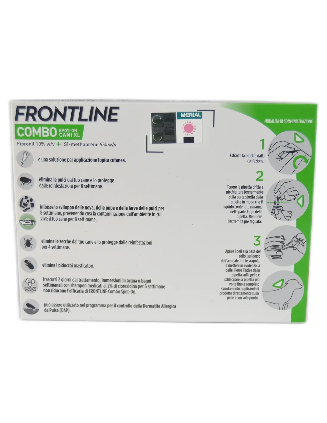 Une pipette de 4,02 ml (xl) pour les chiens de plus de 40 kg, correspondant à la dose minimale recommandée de 6,7 mg/kg de fipronil et 6 mg/kg de (s)-méthoprène, pour application cutanée topique. Il est possible d'observer des modifications passagères de l'aspect du pelage au niveau de la zone d'application (aspect gras et mat du pelage).