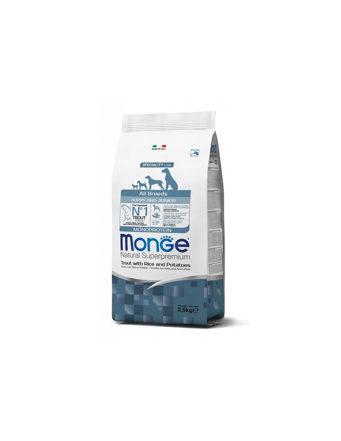 C'est un aliment complet pour les chiots de toutes tailles. Spécialement développé pour le bien-être de votre chien, grâce à la présence de nutriments de qualité issus de la recherche Made in Italy. Produit formulé avec une seule source de protéines animales*, la truite, comme premier ingrédient, et avec l'inclusion de poisson frais pour une digestibilité et une appétence optimales. La recette est enrichie de xylo-oligosaccharides (xos) prébiotiques de dernière génération et de riz brun pour favoriser le bien-être intestinal et d'ingrédients superalimentaires tels que les graines de tournesol, naturellement riches en oméga-6 et en vitamine E. La formulation contient également de la glucosamine et du sulfate de chondroïtine pour soutenir le développement des articulations et un rapport calcium/phosphore équilibré pour une croissance régulière des os et des articulations du chiot. Sans colorants artificiels ni conservateurs ajoutés.