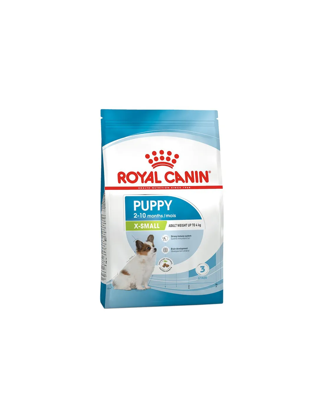 ROYAL CANIN® X-Small Puppy est fabriqué à partir d'ingrédients de haute qualité et formulé pour fournir tous les nutriments nécessaires. Contient des protéines hautement digestibles, des prébiotiques et un mélange de fibres pour une santé digestive optimale. Le complexe breveté d'antioxydants, dont le DHA, soutient le développement des systèmes immunitaire et cérébral. Pour une alimentation correcte, suivez les instructions en fonction du poids et de l'âge du chiot, en veillant à toujours lui fournir de l'eau fraîche et propre.