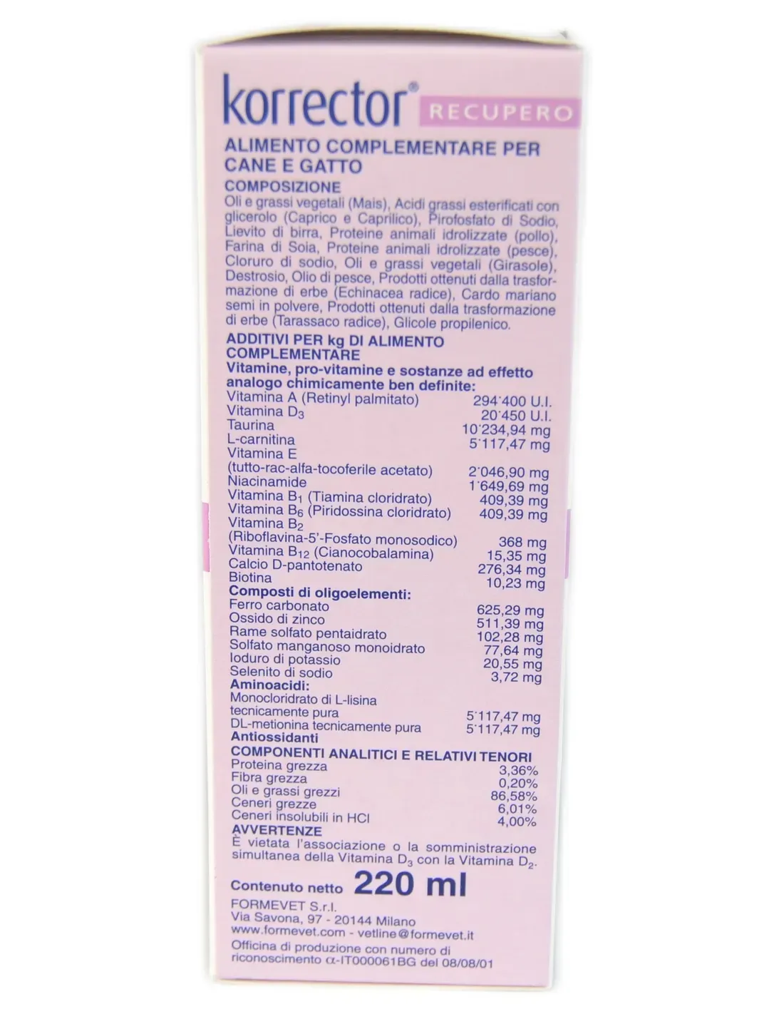 Korrector recovery, grâce à la spécificité de sa formule, son appétence et sa facilité d'administration, est indiqué notamment : pour la préparation du chien athlète et pour le maintenir dans des conditions optimales ; pour retrouver une forme physique parfaite après une activité sportive intense ; comme tonique pendant la convalescence après des maladies, des interventions chirurgicales, des situations stressantes ; pour soutenir un mauvais métabolisme chez les animaux âgés ; soutenir la forme physique des mères pendant l’allaitement ; en cas de manque d'appétit et de mauvaise prise alimentaire.