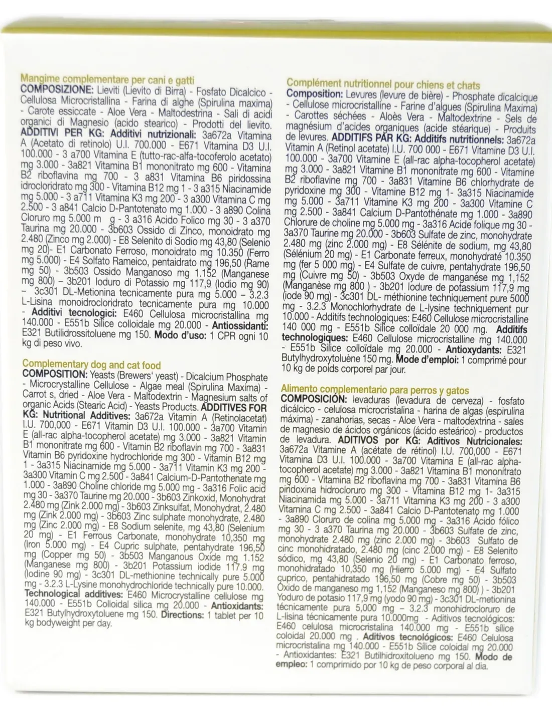 Chiens : 1 comprimé/10 kg de poids corporel. Au-dessus de 40 kg, ne dépassez pas 4 comprimés par jour. Chats : 3 à 5 kg de poids corporel n 1/2 comprimé par jour. Administrer l'aliment complémentaire pendant au moins 30 jours consécutifs en association avec l'alimentation habituelle.