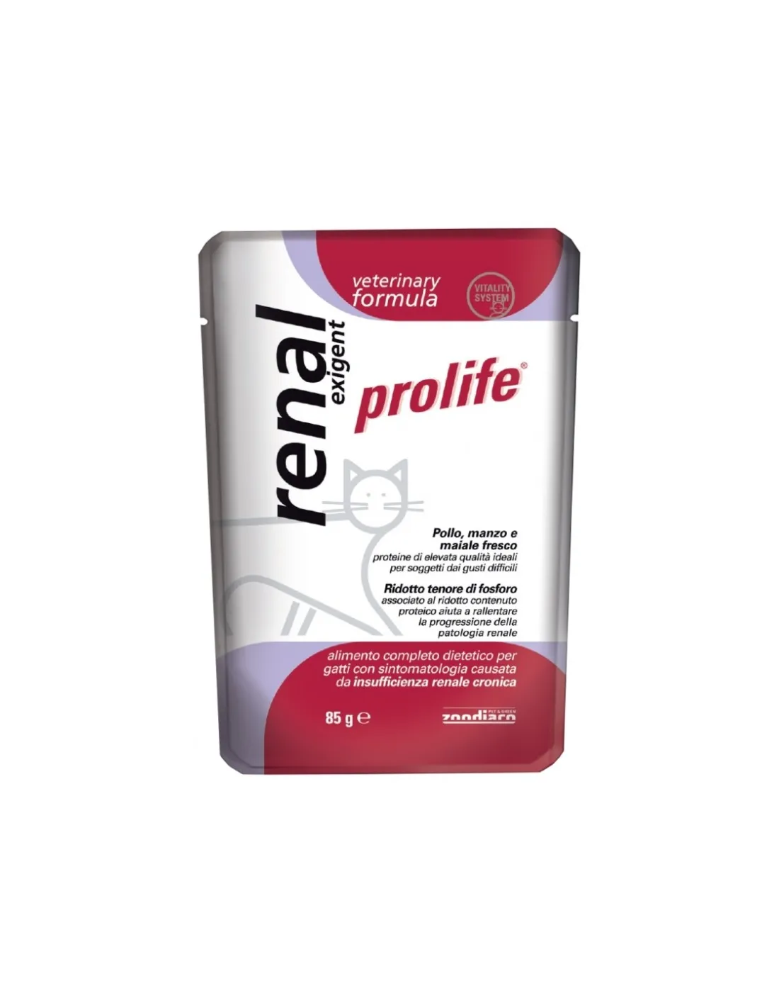 PROLIFE Chat Régime Vétérinaire Renal Exigent 85 gr Wet Cat est un aliment diététique complet formulé spécifiquement pour les chats souffrant d'insuffisance rénale chronique. Ce produit aide à gérer les symptômes et à ralentir la progression de la maladie rénale grâce à sa faible teneur en phosphore.