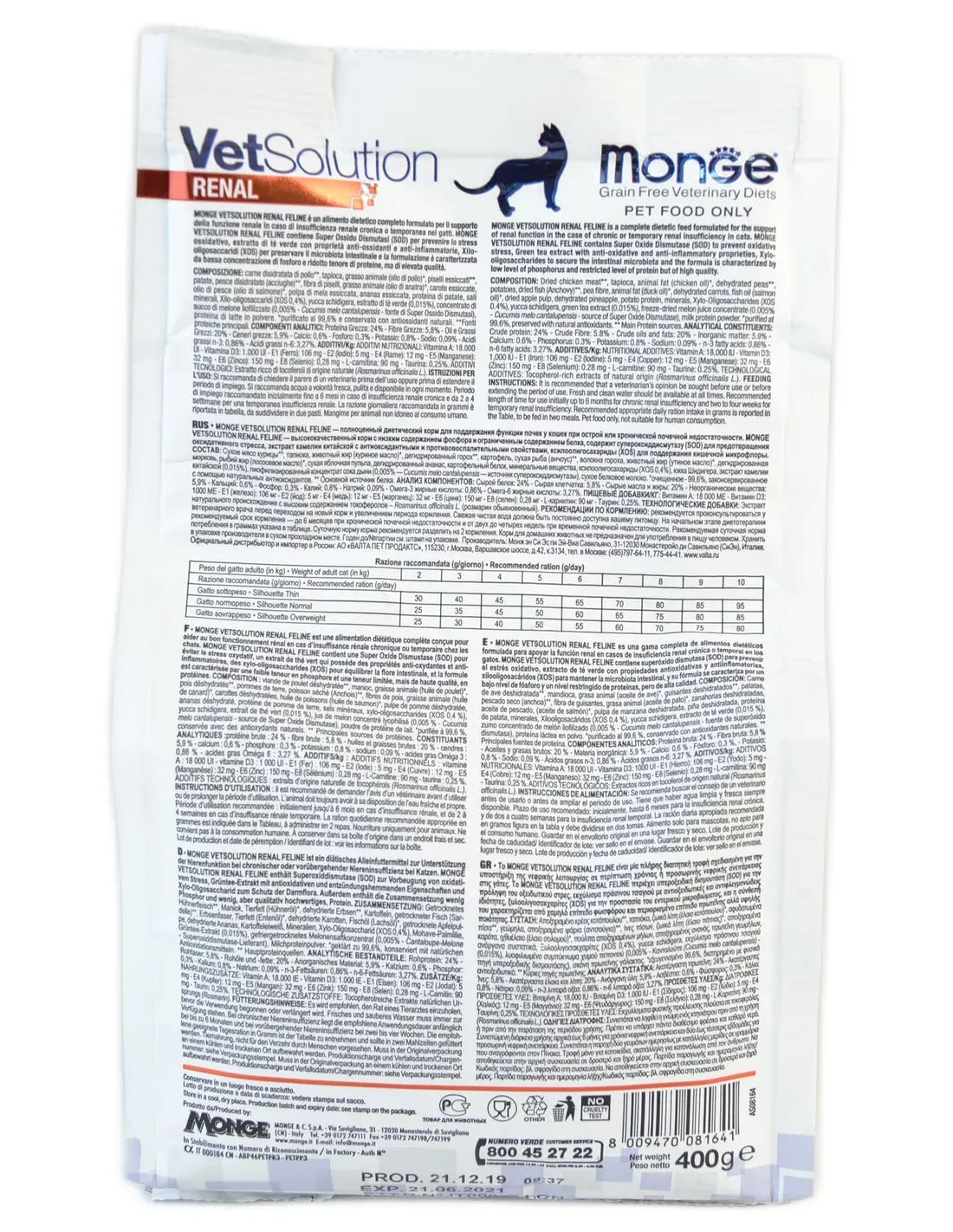 Il est recommandé de demander l'avis d'un vétérinaire avant utilisation ou avant de prolonger la durée d'utilisation. Nous recommandons de disposer à tout moment d’une quantité suffisante d’eau fraîche, propre et disponible. Durée d'utilisation recommandée initialement jusqu'à 6 mois en cas d'insuffisance rénale chronique et 2 à 4 semaines en cas d'insuffisance rénale temporaire. La ration journalière recommandée en grammes est indiquée dans le tableau, à répartir en deux repas. Aliments pour animaux impropres à la consommation humaine. Ration recommandée (grammes par jour) : poids du chat adulte (en kg) : 2 ; ration recommandée (g/jour) pour une silhouette fine : 30 poids du chat adulte (en kg) : 2 ; ration recommandée (g/jour) pour une silhouette idéale : 25 poids du chat adulte (en kg) : 2 ; ration recommandée (g/jour) pour une silhouette robuste : 20 poids du chat adulte (en kg) : 3 ; ration recommandée (g/jour) pour une silhouette fine : 40 poids du chat adulte (en kg) : 3 ; ration recommandée (g/jour) pour une silhouette idéale : 35 poids du chat adulte (en kg) : 3 ; ration recommandée (g/jour) pour une silhouette robuste : 30 poids du chat adulte (en kg) : 4 ; ration recommandée (g/jour) pour une silhouette fine : 45 poids du chat adulte (en kg) : 4 ; ration recommandée (g/jour) pour une silhouette idéale : 45 poids du chat adulte (en kg) : 4 ; ration recommandée (g/jour) pour une silhouette robuste : 40 poids du chat adulte (en kg) : 5 ; ration recommandée (g/jour) pour une silhouette fine : 55 poids du chat adulte (en kg) : 5 ; ration recommandée (g/jour) pour une silhouette idéale : 50 poids du chat adulte (en kg) : 5 ; ration recommandée (g/jour) pour une silhouette robuste : 50 poids du chat adulte (en kg) : 6 ; ration recommandée (g/jour) pour une silhouette fine : 65 poids du chat adulte (en kg) : 6 ; ration recommandée (g/jour) pour une silhouette idéale : 60 poids du chat adulte (en kg) : 6 ; ration recommandée (g/jour) pour une silhouette robuste : 55 poids du chat adulte (en kg) : 7 ; ration recommandée (g/jour) pour une silhouette fine : 70 poids du chat adulte (en kg) : 7 ; ration recommandée (g/jour) pour une silhouette idéale : 65 poids du chat adulte (en kg) : 7 ; ration recommandée (g/jour) pour une silhouette robuste : 60 poids du chat adulte (en kg) : 8 ; ration recommandée (g/jour) pour une silhouette fine : 80 poids du chat adulte (en kg) : 8 ; ration recommandée (g/jour) pour une silhouette idéale : 75 poids du chat adulte (en kg) : 8 ; ration recommandée (g/jour) pour une silhouette robuste : 70 poids du chat adulte (en kg) : 9 ; ration recommandée (g/jour) pour une silhouette fine : 85 poids du chat adulte (en kg) : 9 ; ration recommandée (g/jour) pour une silhouette idéale : 80 poids du chat adulte (en kg) : 9 ; ration recommandée (g/jour) pour une silhouette robuste : 75 poids du chat adulte (en kg) : 10 ; ration recommandée (g/jour) pour une silhouette fine : 95 poids du chat adulte (en kg) : 10 ; ration recommandée (g/jour) pour une silhouette idéale : 85 poids du chat adulte (en kg) : 10 ; ration recommandée (g/jour) pour une silhouette robuste : 80