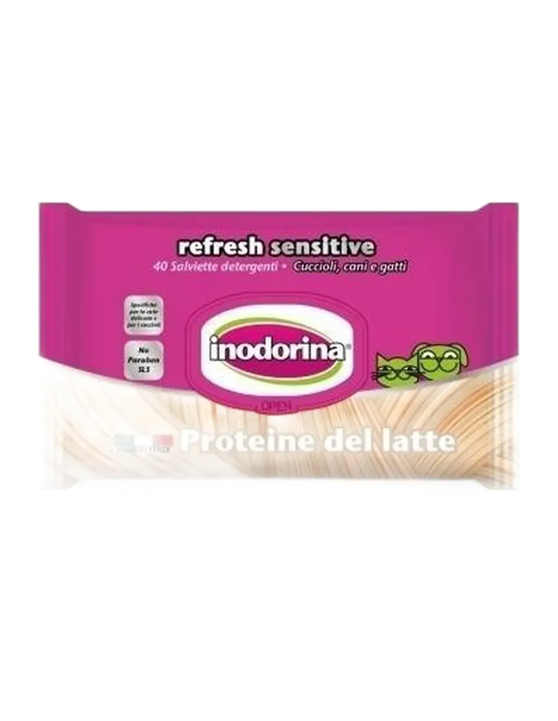 Les lingettes Inodorina Refresh Sensitive ont une formulation adaptée aux peaux délicates sujettes aux allergies et aux chiots.
