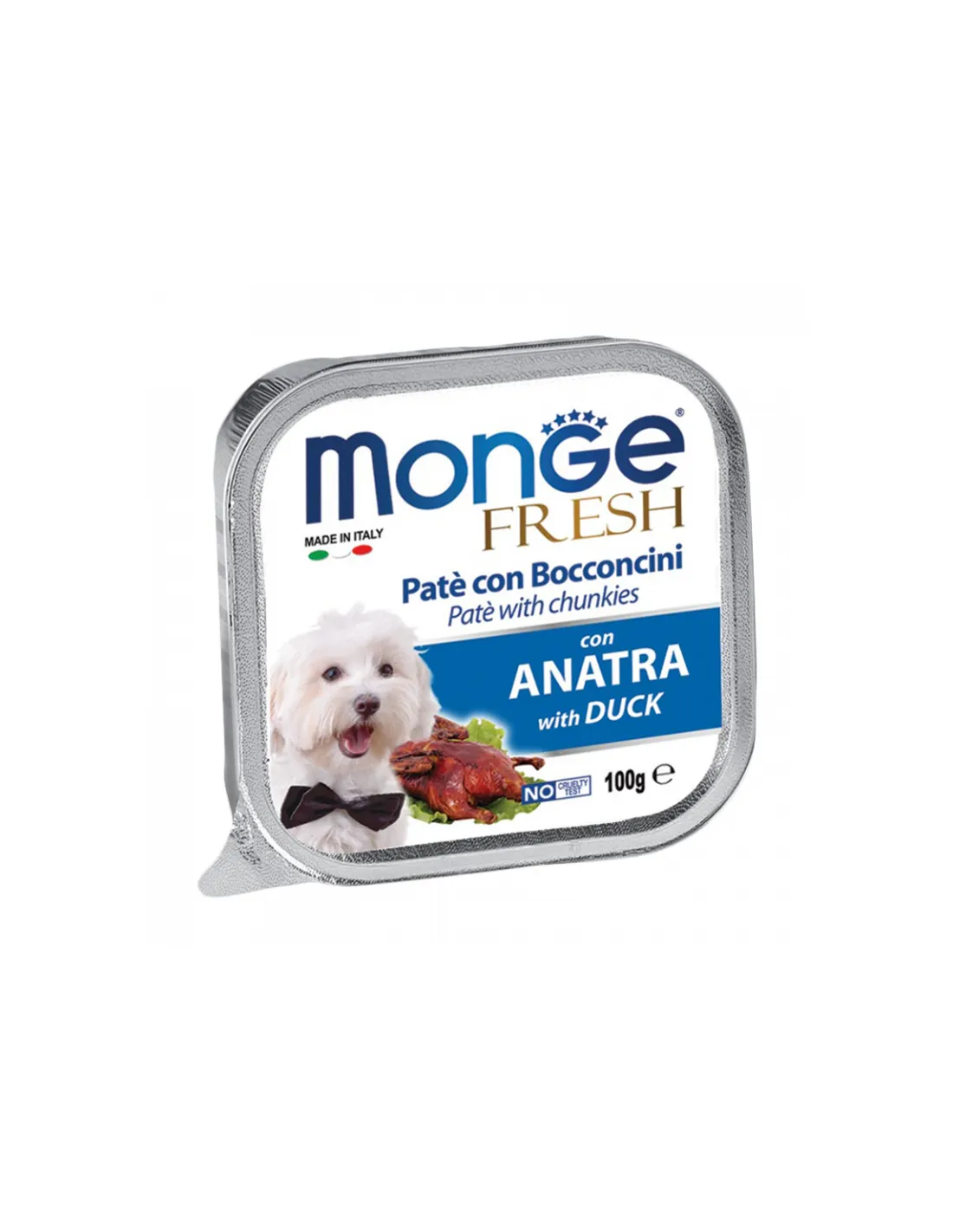 Monge Fresh Paté and Chunks with Duck est un produit sans danger pour votre chien. Il a été formulé sans colorants ni conservateurs, ce qui signifie qu'il ne contient aucun ingrédient artificiel qui pourrait être nocif pour votre animal. Furthermore, it is a No Cruelty Test product, which means that it has not been cruelly tested on animals.