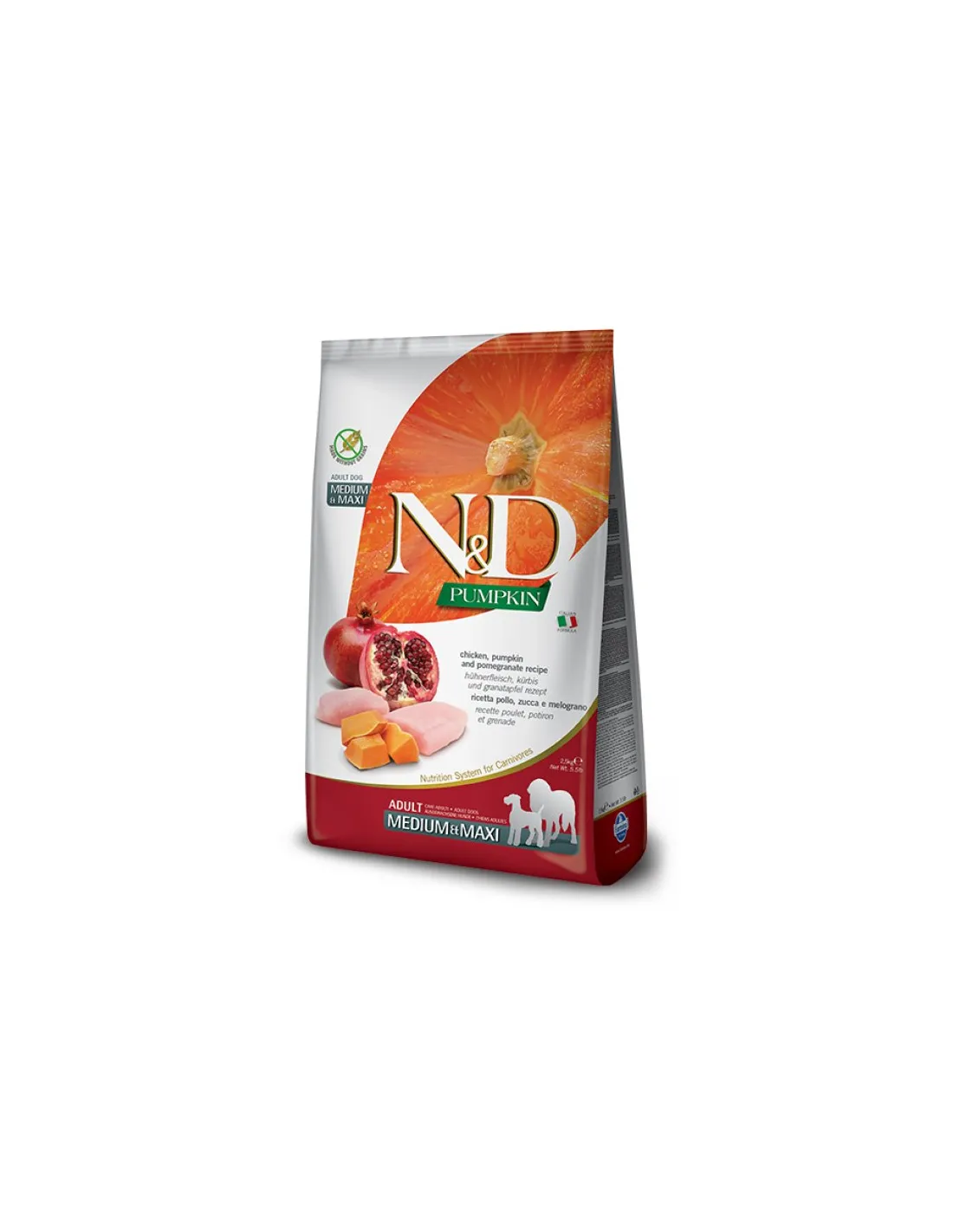 Farmina n&d Pumpkin Grain Free Adult Mini Poulet Citrouille et Grenade 7 kg est un aliment complet pour chiens adultes à base de poulet, citrouille et grenade.
