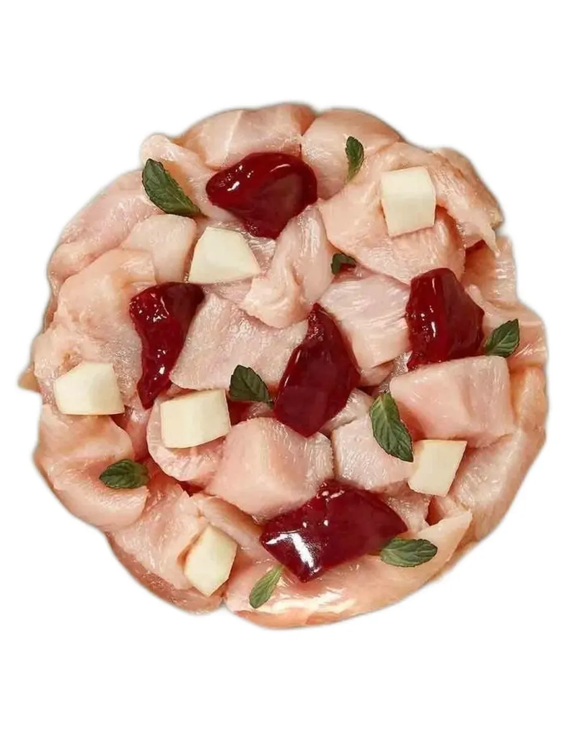 Ingrédients : Cœur de poulet (30 %), estomac de poulet (26 %), peau de poulet (14 %), muscle de poulet (10 %), foie de poulet (10 %), courge musquée (4 %), poudre de tomate, huile de colza, algues*, herbe à chat*, minéraux *Ingrédient sec