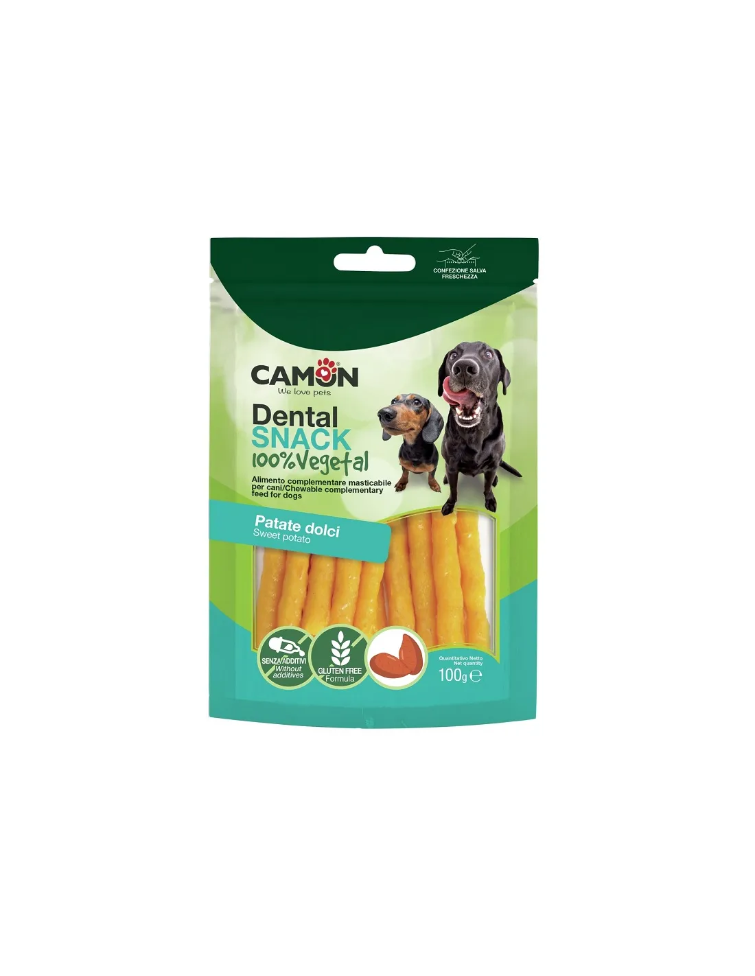Camon Bauveg Stick à la Patate Douce est une délicieuse collation pour chien 100% végétale, sans gluten ni additifs. Ces sticks sont conditionnés dans un emballage pratique avec un sceau fraîcheur pour garder le produit toujours frais. Le poids est de 100 g. La patate douce, ingrédient principal de ces snacks, est connue pour être riche en fibres et en nutriments, contribuant positivement à la santé digestive et générale du chien. La consistance des sticks a été conçue pour offrir une expérience de mastication agréable et contribuer au maintien de l'hygiène dentaire du chien.