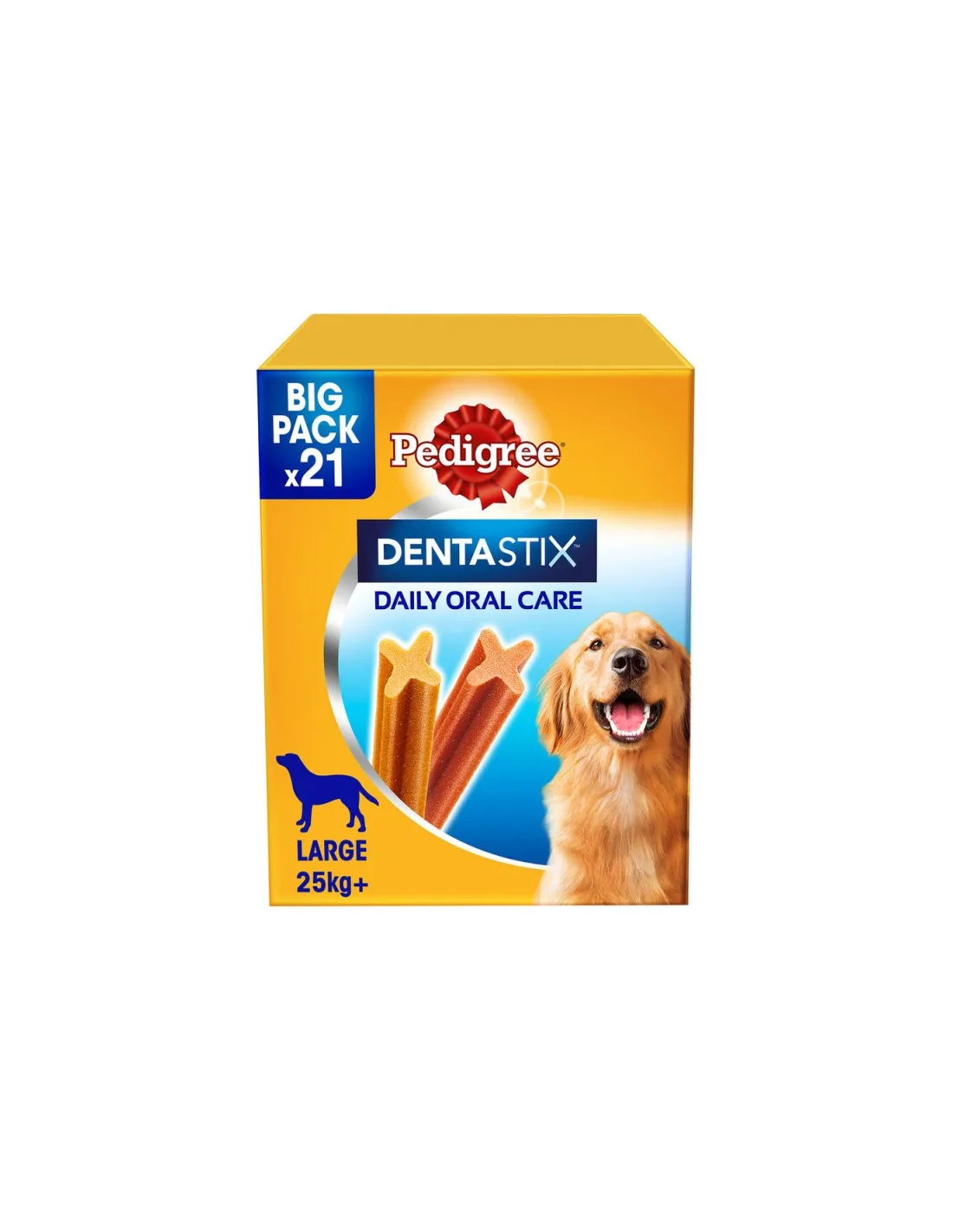 Pedigree Dentastix est destiné à être utilisé chez les chiens de grande race. Il est conçu pour contribuer à la santé bucco-dentaire de votre animal en réduisant l'accumulation de plaque dentaire et de tartre. Ce produit peut être utilisé dans le cadre d'une alimentation équilibrée et ne doit pas être utilisé en remplacement d'un repas complet.
