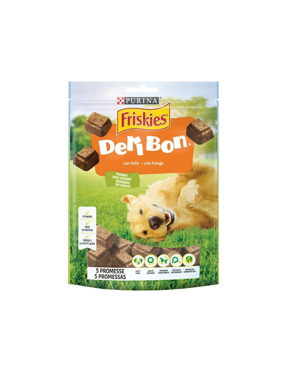 Les délicieuses bouchées au poulet Purina Friskies Delibon Dog Snack peuvent être données comme collation entre les repas ou comme récompense pendant l'entraînement. Veillez à adapter la quantité de friandises à la taille, à l'âge et au niveau d'activité de votre chien.