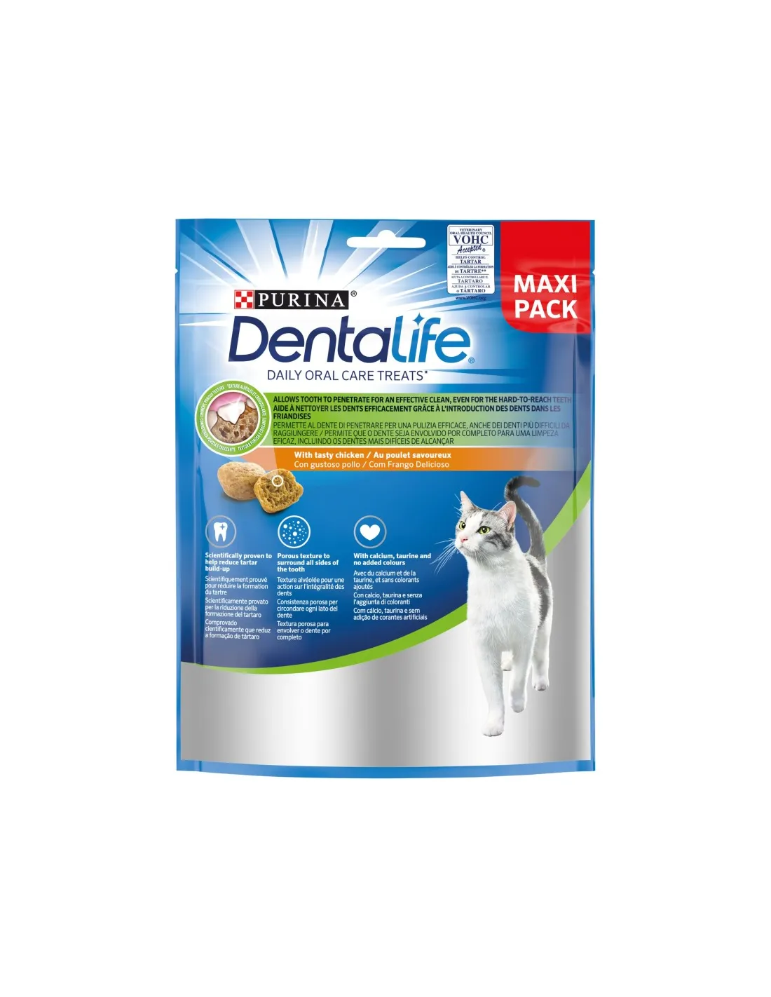 Purina DentaLife Poulet pour Chats est indiqué pour le nettoyage quotidien des dents des chats. Cette collation aide à garder des gencives saines et à réduire la formation de tartre et de plaque dentaire. Il est particulièrement utile pour les chats qui ont tendance à développer des problèmes dentaires ou pour ceux qui ne permettent pas le nettoyage dentaire manuel.
