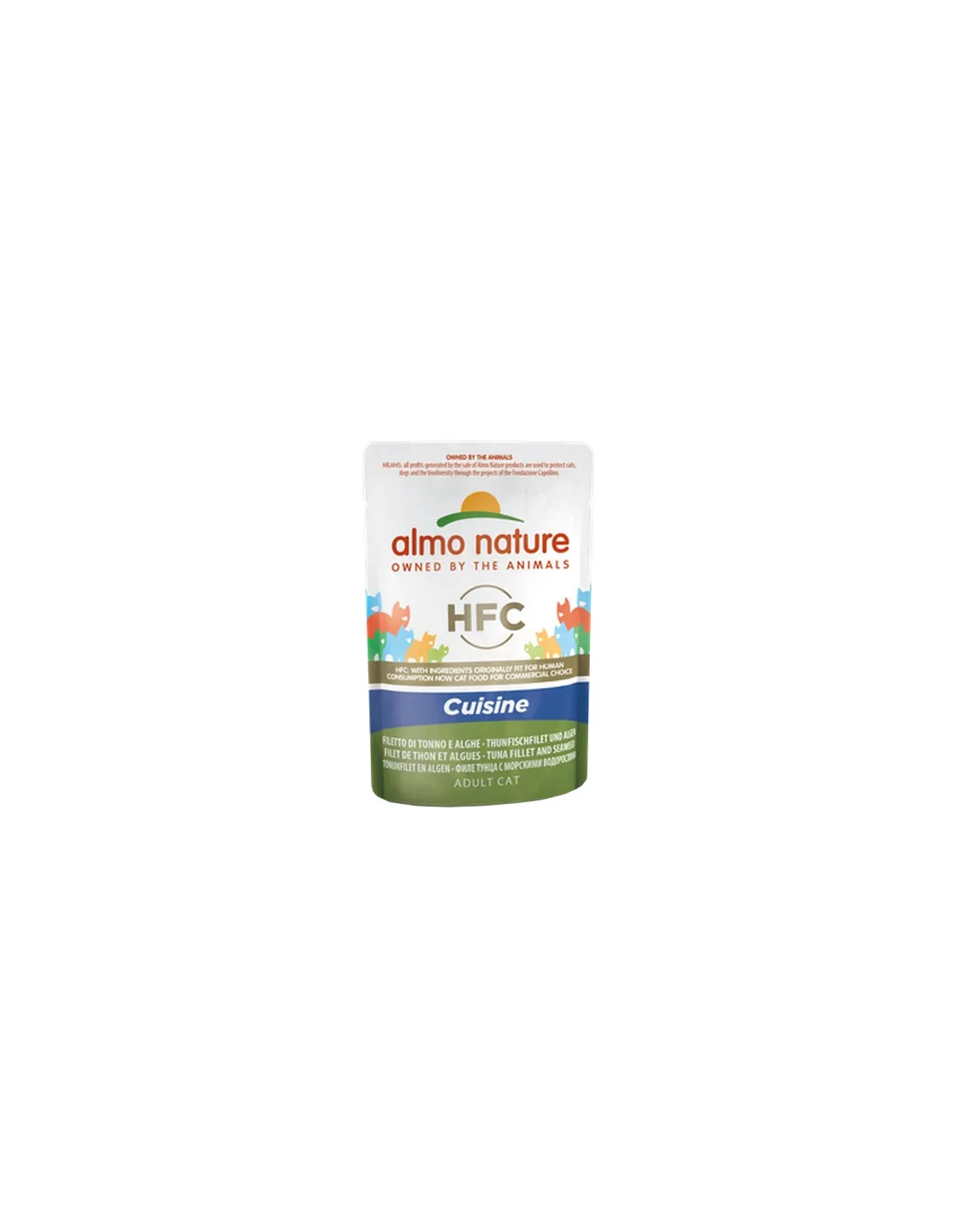 Almo Cat Cuisine 55 Gr Filet de Thon et Algues est destiné exclusivement aux chats, s'adaptant parfaitement aux besoins nutritionnels de cette espèce. Il convient aux chats domestiques de toutes races, âges et conditions de vie, avec une attention particulière à ceux qui préfèrent les aliments à base de poisson ou qui ont besoin d'une alimentation facile à digérer et riche en nutriments marins.