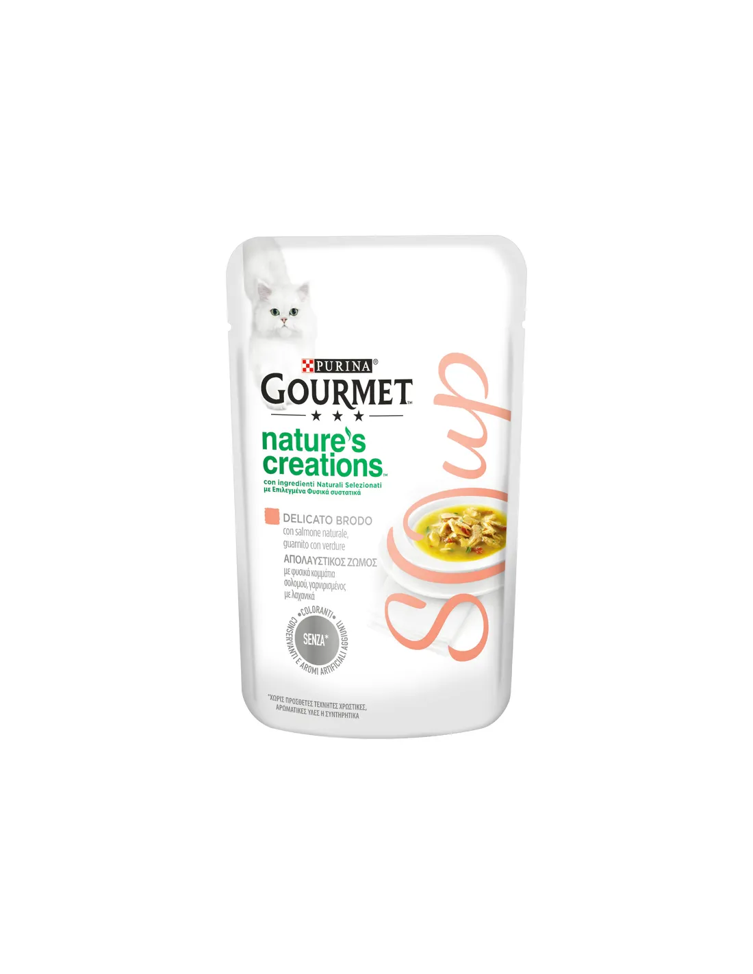Nature's Creations Soup Les soupes gastronomiques ont été développées avec une attention aux détails, pour offrir non seulement un repas savoureux, mais également un aliment sûr et de qualité. Chaque sachet en portion individuelle est un concentré de bienfaits naturels, avec des composants raffinés qui ressortent clairement à l'œil et au palais. La variété de saveurs disponibles garantit qu'il y a toujours une nouvelle expérience gustative à découvrir, gardant le repas intéressant et appétissant pour votre chat.