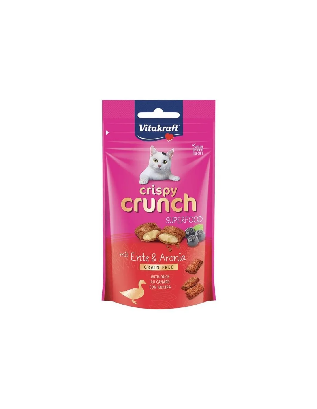 Vitakraft Crispy Crunch Superfood au Canard et à l'Aronia est une collation de 60 g pour chats. Cette délicieuse collation croustillante fourrée crémeuse est idéale pour vos amis félins. Les friandises ne contiennent ni sucre ni céréales, ce qui en fait une option saine pour votre chat.
