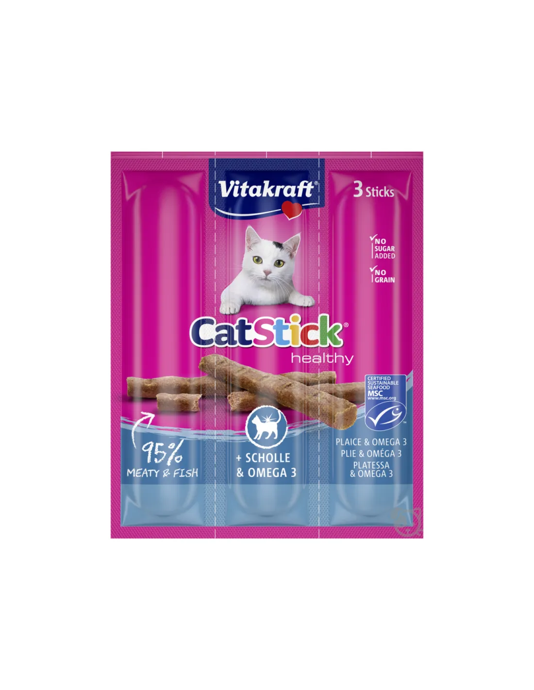 Vitakraft Catstick Healthy plies & omega-3 est une collation pour chats qui combine le goût irrésistible de la plie avec les bienfaits des acides gras oméga-3. Ce produit est idéal pour garder la peau et le pelage de votre chat en excellent état, grâce à sa riche composition d'ingrédients naturels et de nutriments essentiels.
