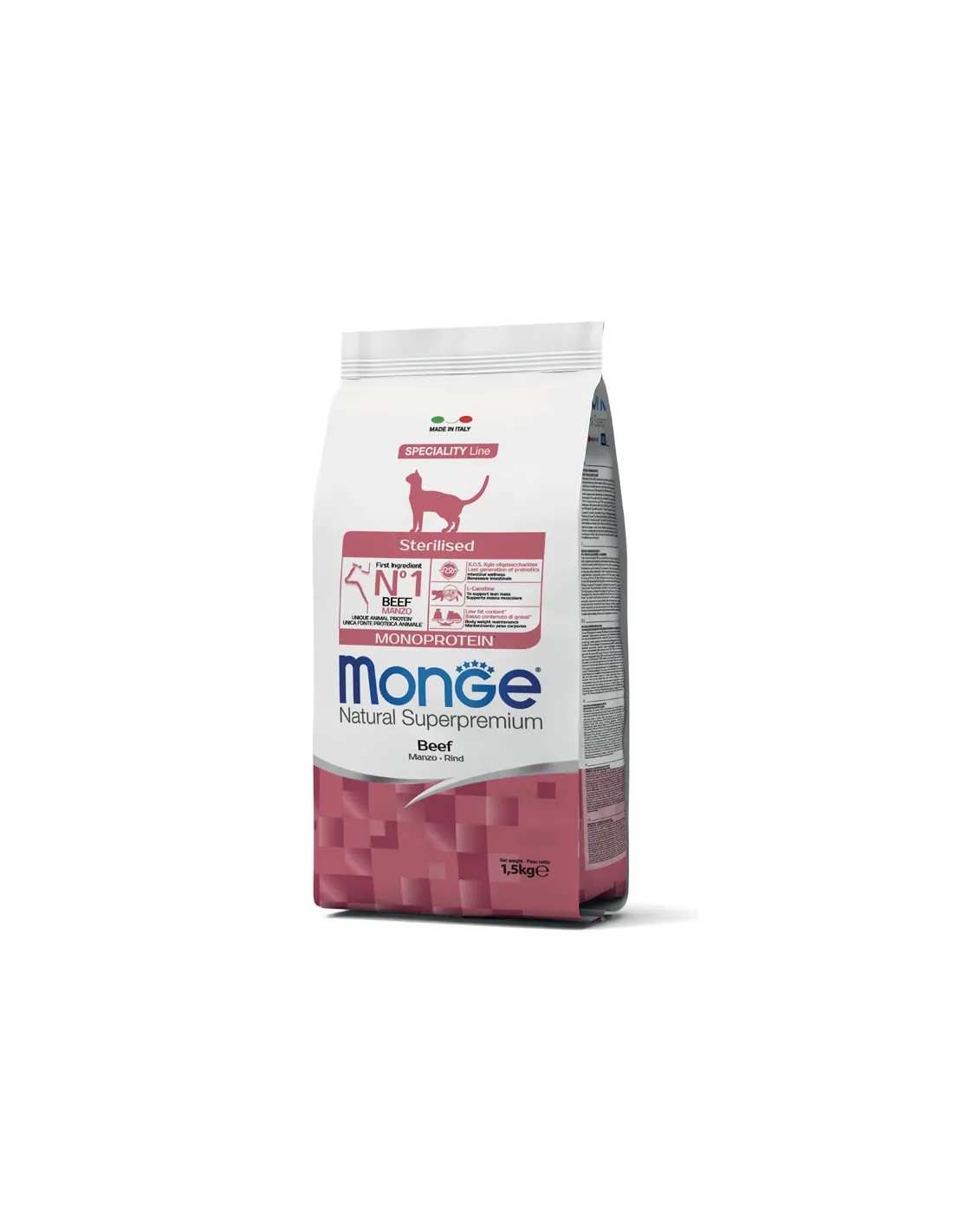 Le bœuf stérilisé pour chat monoprotéiné* naturel superpremium Monge est un aliment complet et équilibré pour chat adulte. Spécialement formulé pour votre chat adulte stérilisé grâce à la présence d'une faible teneur en matières grasses** pour aider à maintenir un poids corporel idéal et avec de la L-carnitine pour soutenir la masse musculaire. *formulé avec une seule source de protéines animales (boeuf), enrichi en xylo-oligosaccharides (xos), prébiotiques qui soutiennent le bien-être intestinal. Des ingrédients raffinés, comme l'églantier, avec des composants antioxydants pour aider à neutraliser les radicaux libres et le yucca schidigera pour contrôler les odeurs intestinales, sont le résultat de la recherche Made in Italy pour soutenir la qualité de vie de nos chats. Sans colorants artificiels ni conservateurs ajoutés. **Par rapport au produit standard (Monge Natural Superpremium chat adulte riche en poulet)