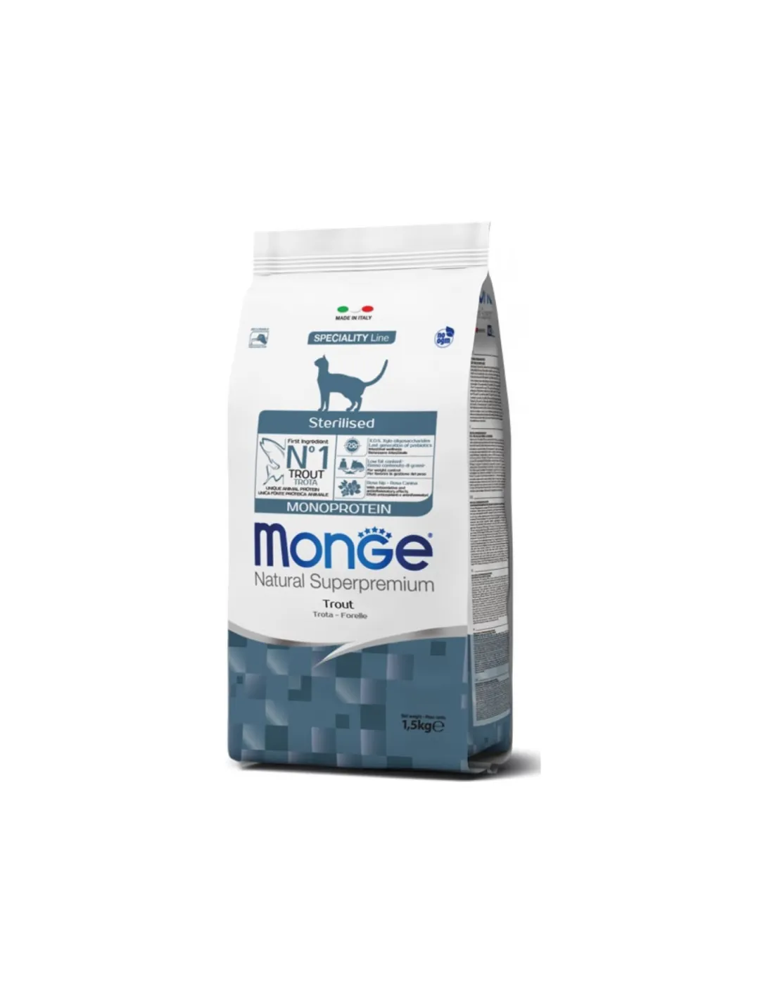 Monge Natural Superpremium Monoprotein Sterilized Cat Trout est indiqué pour les chats adultes stérilisés qui nécessitent une alimentation spécifique pour maintenir un poids idéal. La formule faible en gras aide à prévenir l'obésité, courante chez les chats castrés, tandis que la présence d'ingrédients naturels de haute qualité soutient la santé globale de l'animal.