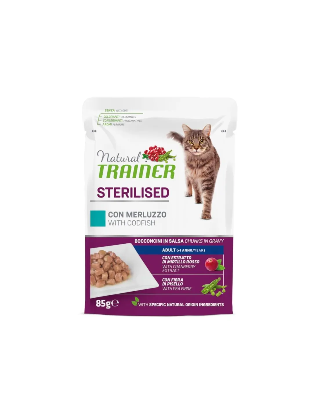 Le "Natural Trainer - Adulte Stérilisé avec Morceaux de Morue en Sauce" est conçu pour répondre aux besoins spécifiques des chats stérilisés, qui ont tendance à avoir un besoin calorique réduit mais une plus grande prédisposition à la prise de poids. La formule équilibrée avec des protéines de haute qualité aide à maintenir la masse musculaire maigre. L'ajout de fibres alimentaires contribue à une sensation de satiété, aidant ainsi à contrôler le poids.