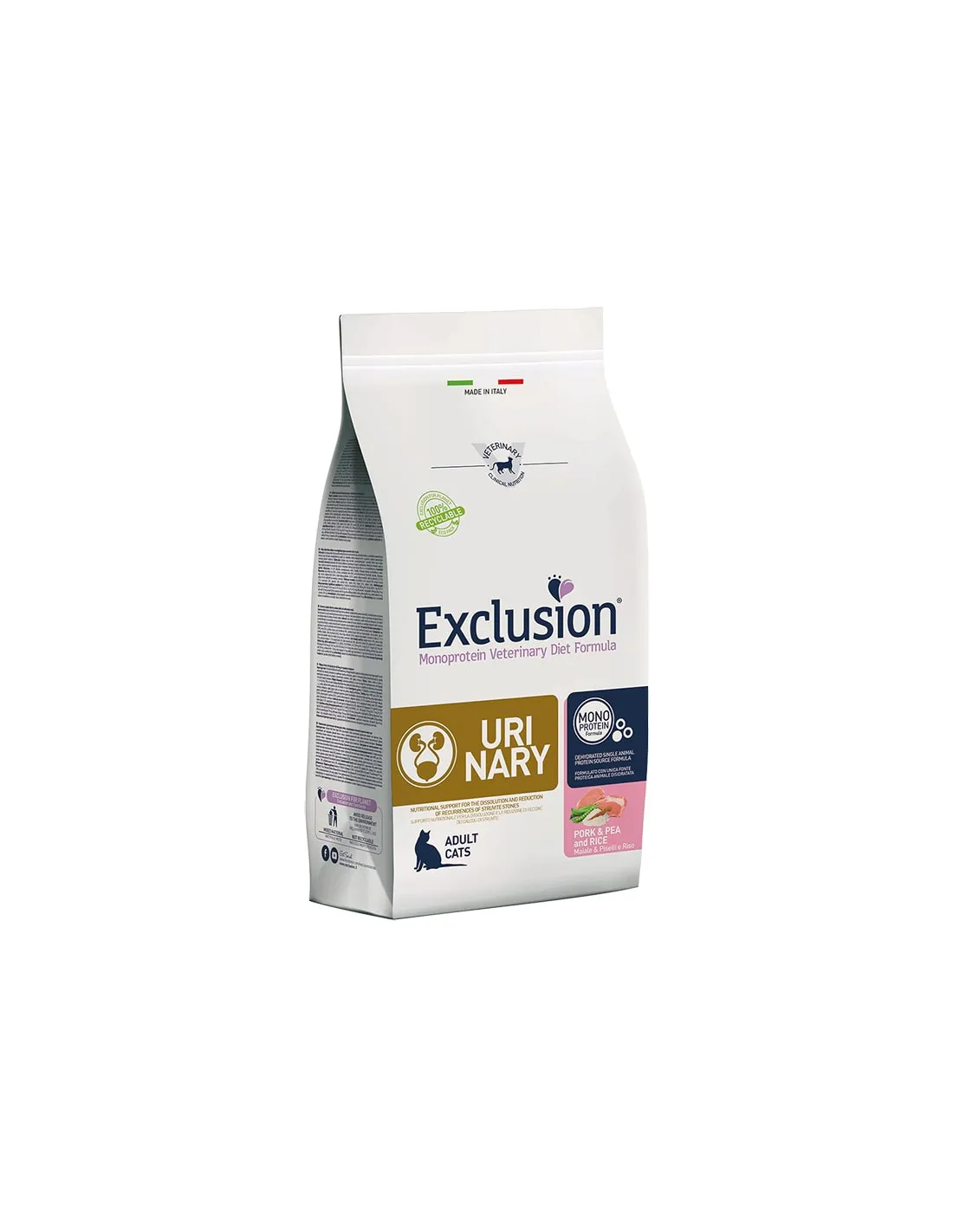 Exclusion Diet Urinary Chicken est un aliment sec diététique complet formulé spécifiquement pour les chiens adultes souffrant de problèmes des voies urinaires inférieures. Sa recette à base de poulet et de riz est conçue pour soutenir la santé du système urinaire, contribuant à la dissolution des calculs de struvite et réduisant le risque de récidive. Cet aliment sec se distingue par sa haute digestibilité, grâce à l'utilisation d'ingrédients sélectionnés de haute qualité comme le poulet comme seule source de protéines animales et le riz comme source de glucides facilement assimilables. L'aliment est équilibré pour répondre également aux besoins nutritionnels des chiens sensibles, avec une faible teneur en magnésium et un apport modéré en protéines et en graisses afin de maintenir un pH urinaire contrôlé, réduisant ainsi la possibilité de formation de calculs.