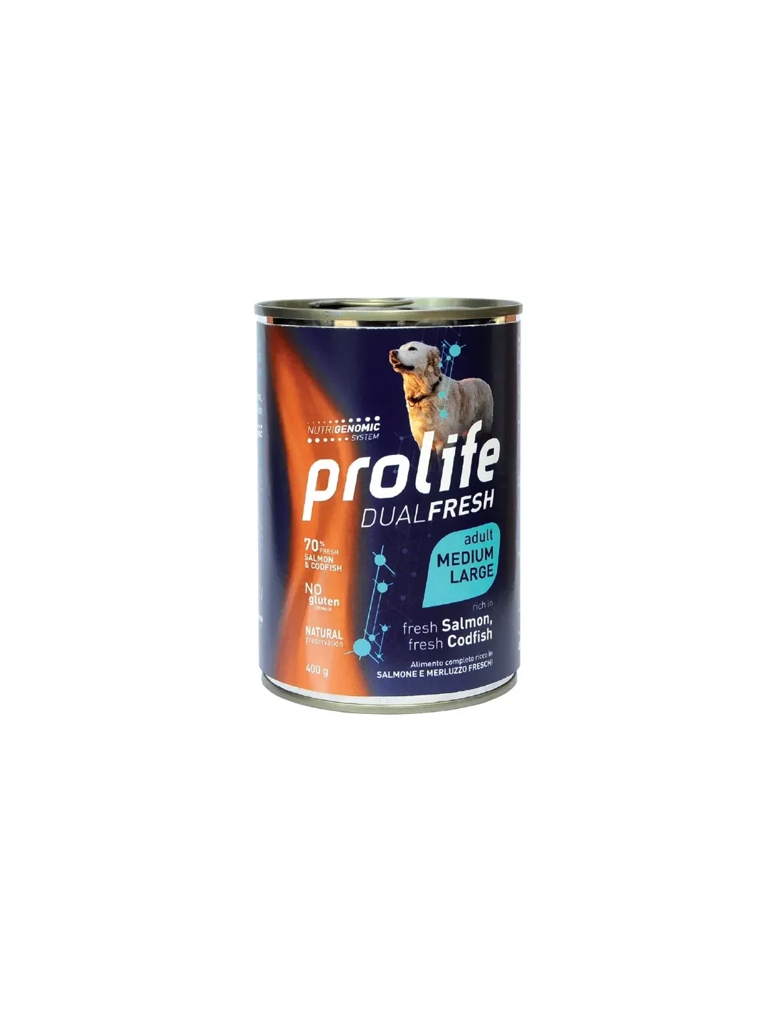 Il "Prolife Adult Salmone e Merluzzo 400g umido cane dual fresh" è un alimento completo e bilanciato, ideato per soddisfare le esigenze nutrizionali dei cani adulti di taglia media e grande. Questo prodotto si distingue per il suo elevato contenuto di Pesce Fresco, pari al 70%, fornendo così una fonte di proteine di alta qualità e facilmente digeribili. La presenza di Salmone Fresco e Merluzzo Fresco non solo garantisce un apporto nutrizionale ottimale, ma anche un gusto irresistibile che soddisfa anche i palati più esigenti.