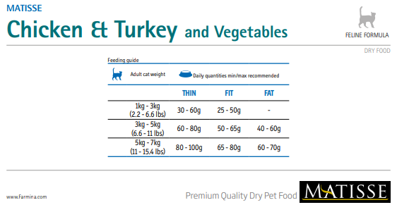 Proteina grezza 32.00%; oli e grassi grezzi 11.00%; fibra grezza 1.20%; ceneri grezze 6.60%; Calcio 1.00%; Fosforo 0.90%; Magnesio 0.08%; Taurina 1800mg/kg.