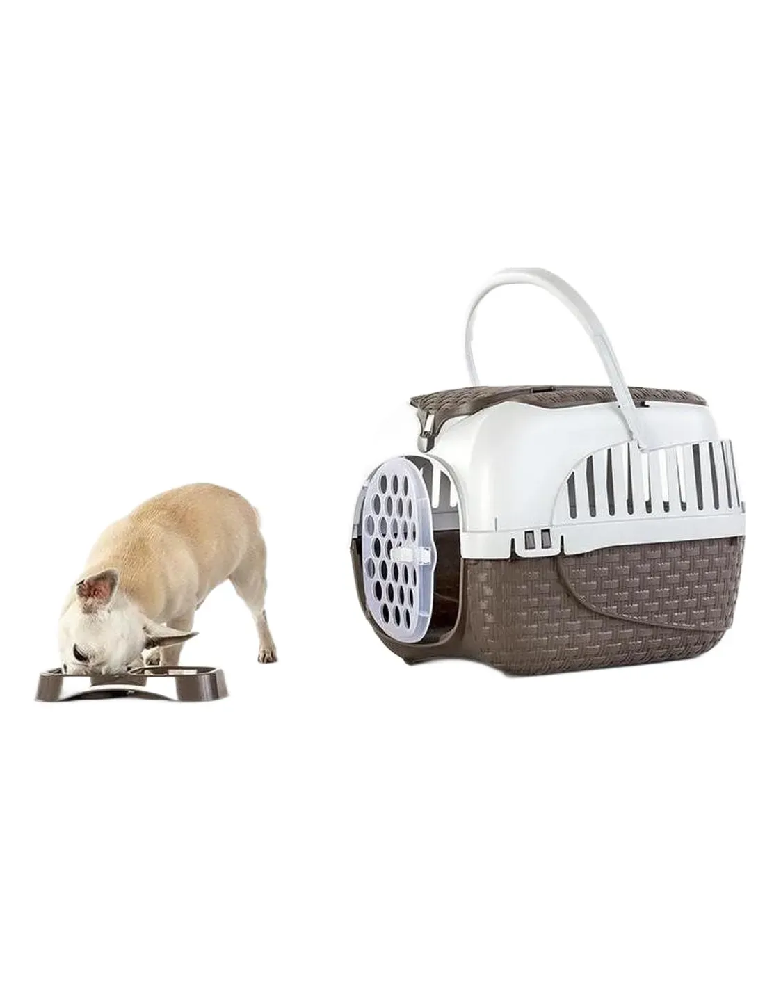 Transporter dla psa i kota jest dostępny w trzech kolorach: różowym, jasnoniebieskim i gołębim szarym oraz w komplecie z miską podróżną.