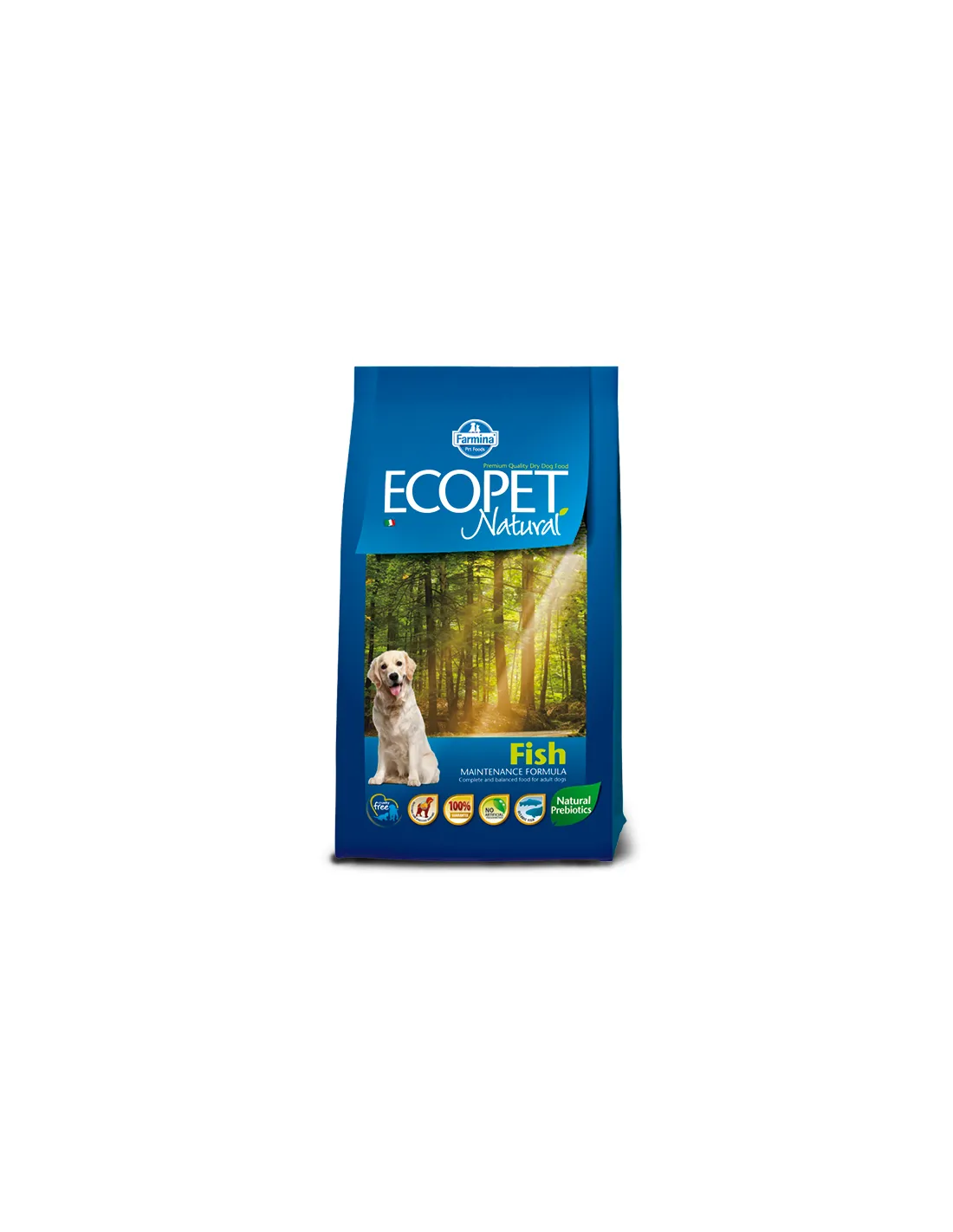 Główne składniki Ecopet Natural Fish Medium to kukurydza, suszone ryby (14%), suszone mięso z kurczaka, mąka pszenna, ryż, tłuszcz z kurczaka, wszystkie wybrane ze względu na wysoką strawność i wartość odżywczą. Skład wzbogacono suszoną pulpą buraczaną, naturalnym źródłem błonnika, oraz chlorkiem sodu, niezbędnym do utrzymania równowagi hydroelektrolitowej.