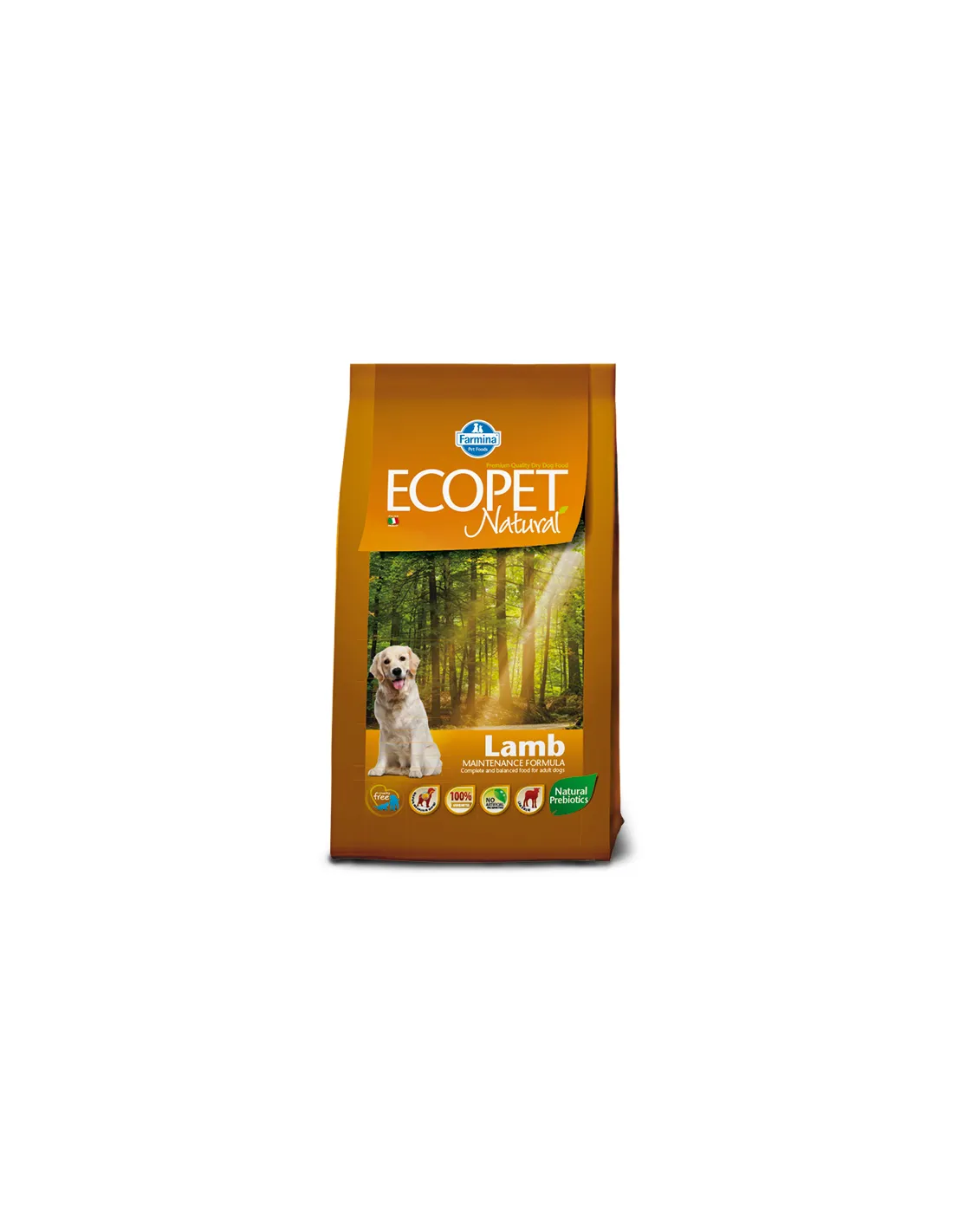 Skład Farmina Ecopet Natural Medium Lamb został opracowany z myślą o zaspokojeniu potrzeb żywieniowych dorosłych psów średniej wielkości. Główne składniki to ryż i kukurydza jako źródła węglowodanów złożonych, suszony kurczak i jagnięcina dostarczające wysokiej jakości białka, tłuszcz z kurczaka i olej rybny będący źródłem niezbędnych nienasyconych kwasów tłuszczowych. Ponadto formuła została wzbogacona suszoną pulpą buraczaną, która pomaga regulować pracę jelit, a także ekstraktami z korzenia cykorii i oligosacharydami na bazie mannozy, które wspierają zdrowie jelit i układ odpornościowy.