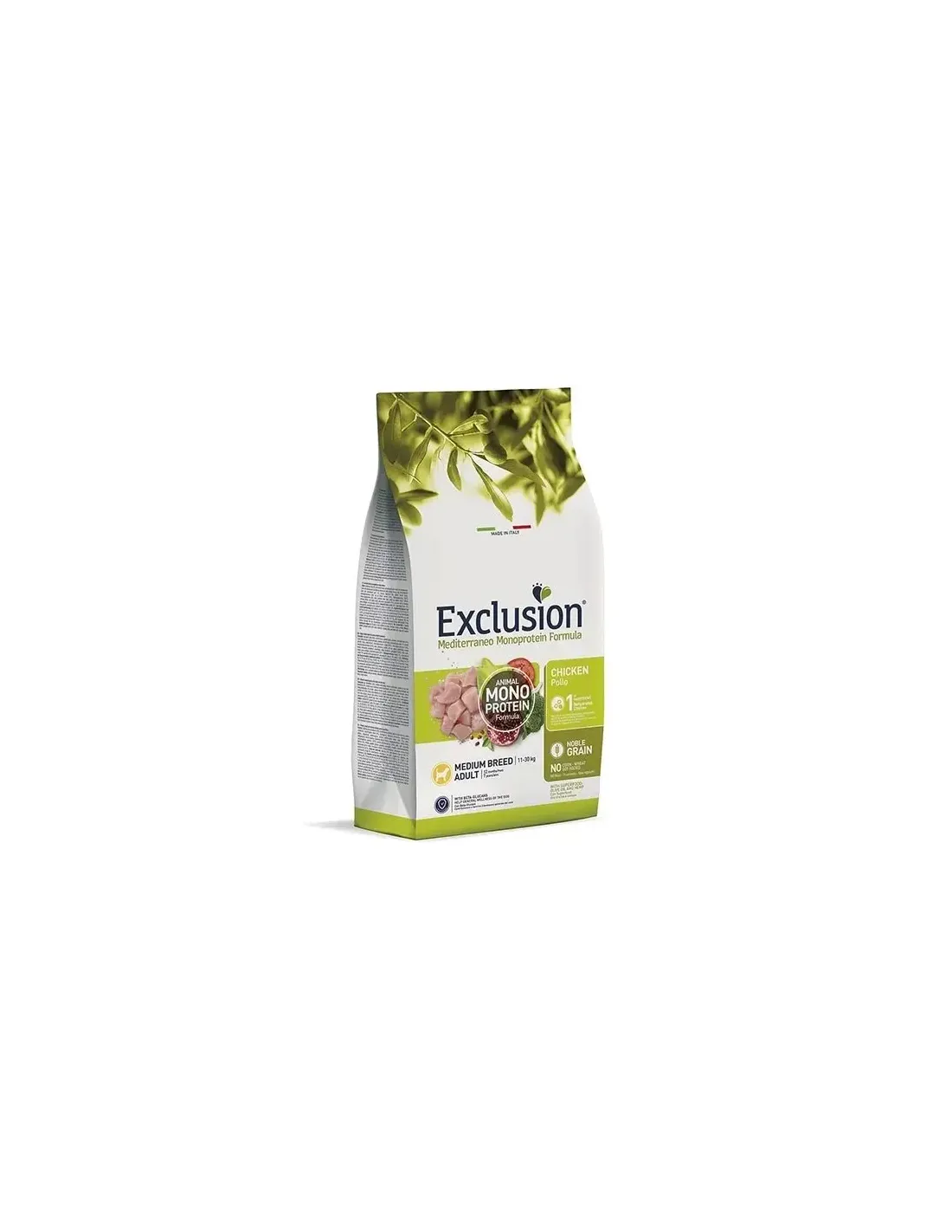 Sercem pożywki Exclusion Mediterraneo Adult Pollo Medium są wysokiej jakości białka pochodzące głównie z kurczaka, wybrane ze względu na doskonałe właściwości odżywcze i doskonałą strawność. W składzie znajduje się także połączenie węglowodanów pochodzących ze zbóż i wyselekcjonowanych źródeł roślinnych, które zapewniają stopniowe uwalnianie energii, idealne dla psów średniej wielkości o dynamicznym metabolizmie. Spożycie błonnika jest dostosowane tak, aby sprzyjać regularności pracy jelit i dobremu samopoczuciu trawienia. Zawiera naturalne oleje bogate w kwasy tłuszczowe Omega-3 i Omega-6, niezbędne dla zdrowia skóry i sierści, a także wzmacniające odporność. W preparacie znajdują się także witaminy (w tym witamina E i grupa B) oraz minerały (m.in. cynk i selen) przydatne do wspomagania funkcji fizjologicznych i przeciwdziałania działaniu wolnych rodników. Kompozycję uzupełniają śródziemnomorskie składniki wyselekcjonowane ze względu na ich dobroczynne i naturalne właściwości, które nadają produktowi wartość dodaną, poprawiając jakość i naturalność żywności.