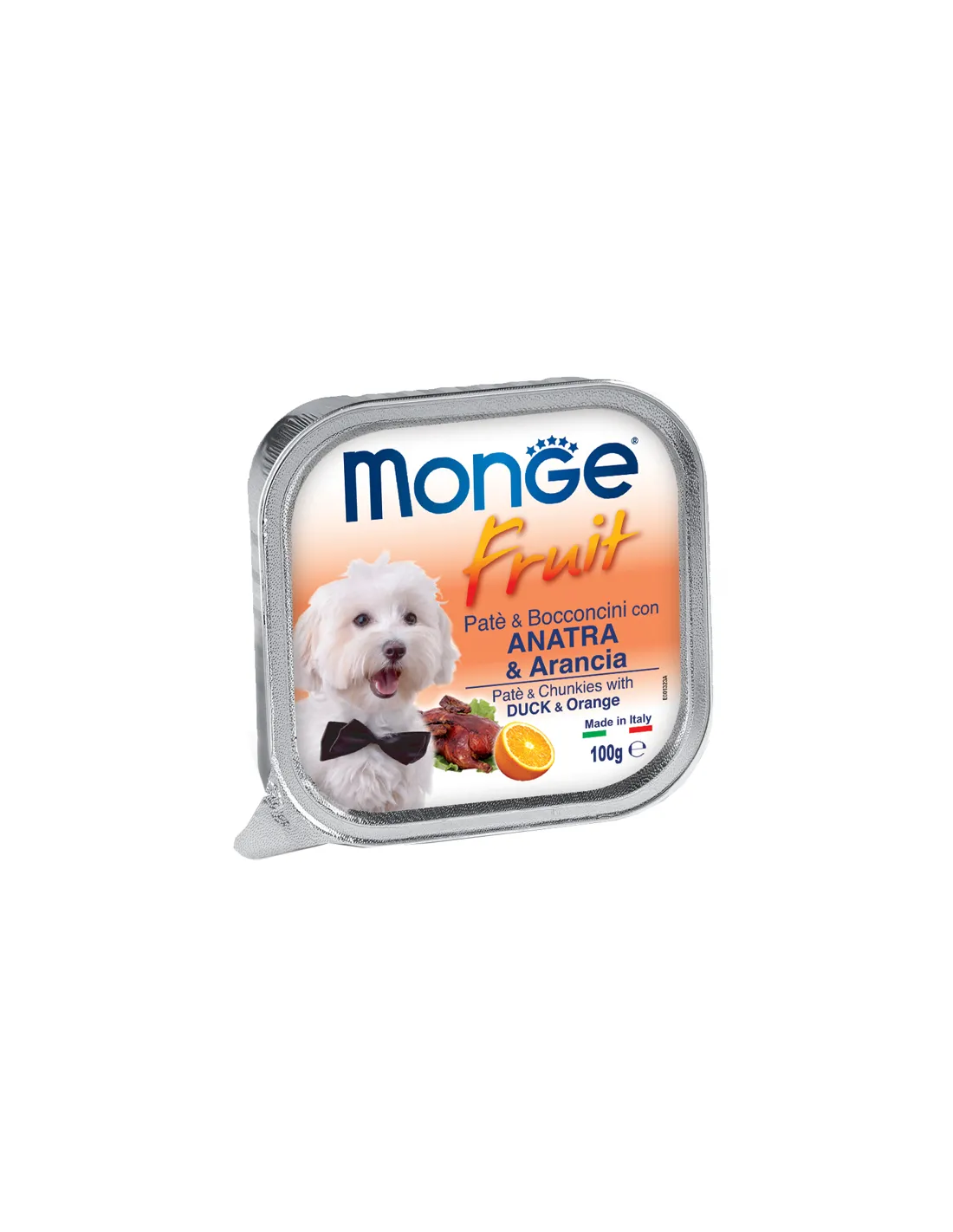 Opis produktu Monge Fruit Paté and Bites with Kaczka i Pomarańcza to kompletna karma dla dorosłych psów. To pyszny pasztet z kawałkami świeżej kaczki, wzbogacony owocami takimi jak pomarańcza, będącym naturalnym źródłem witamin i minerałów. Została opracowana tak, aby wspierać codzienne dobre samopoczucie psów i jest szczególnie odpowiednia dla małych psów, ale może być również stosowana jako nagroda dla większych psów.