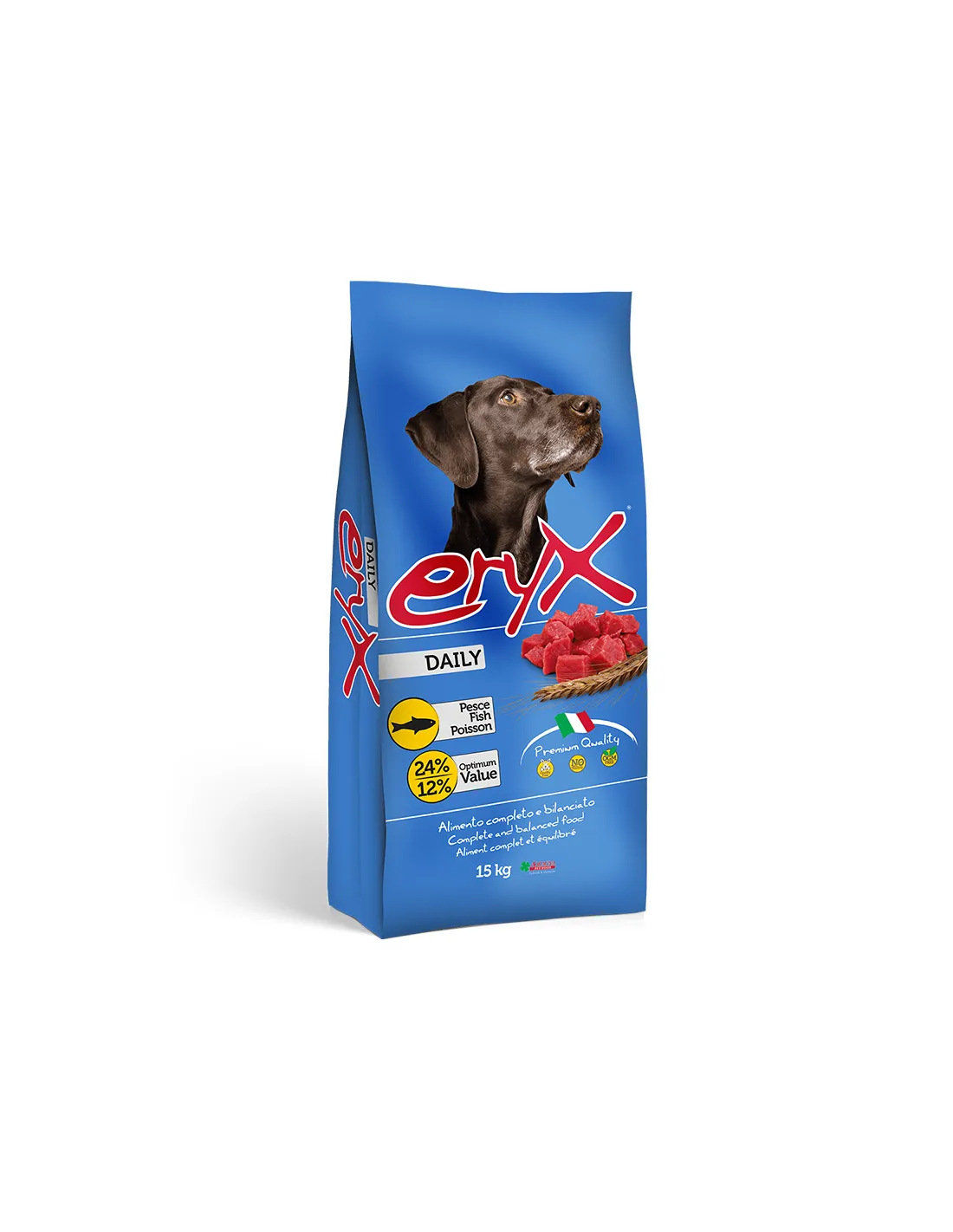 Eryx Daily Fish to kompletna i zbilansowana karma dla dorosłych psów o normalnej aktywności fizycznej. Produkt ten zawiera wyselekcjonowane, wysokiej jakości składniki, w tym ryby bogate w kwasy Omega 3, które pomagają utrzymać psa w dobrej kondycji fizycznej. Eryx Daily Fish jest dostępny w formatach 3 kg i 15 kg.