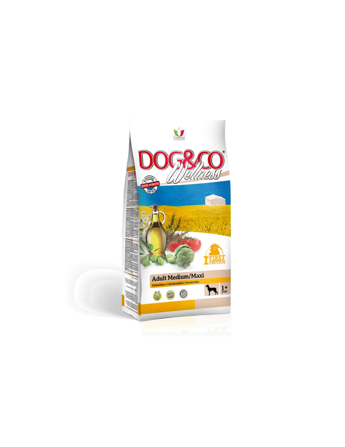 Produkt „Adult Medium/Maxi – Kurczak i Ryż” to kompletna sucha karma, specjalnie opracowana dla średnich i dużych dorosłych psów. Produkt ten łączy w sobie wysokiej jakości składniki, takie jak kurczak i ryż, z typowo śródziemnomorskimi elementami, takimi jak rozmaryn i oliwa z oliwek, które działają jak naturalne konserwanty.