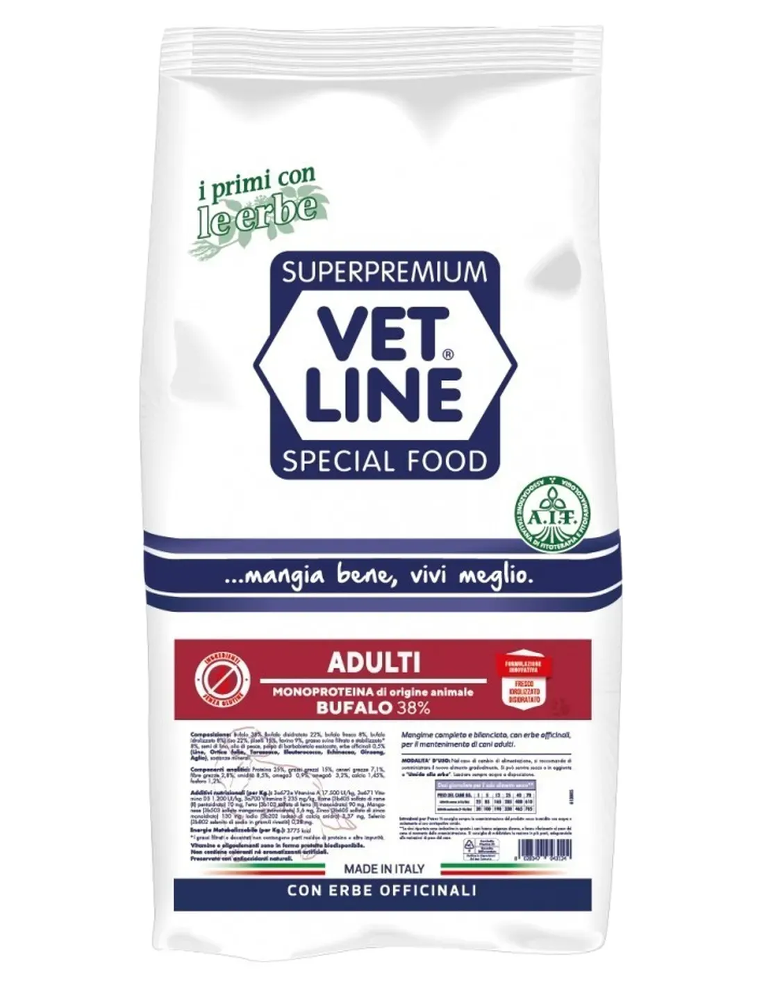 Kompletna i zbilansowana sucha karma, zawierająca świeże mięso i zioła lecznicze, przeznaczona dla dorosłych psów. monoproteinowy pokarm dla bawołów.