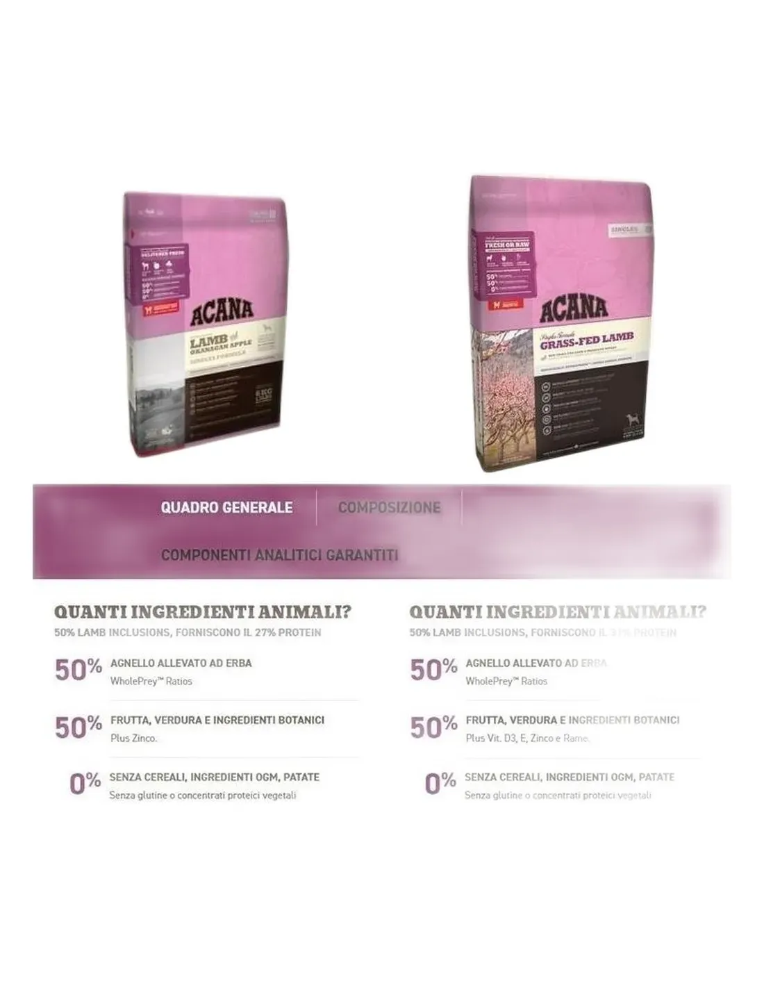 ACANA Grass-Fed Lamb zawiera tylko jedno źródło białka i występuje w proporcjach całej ofiary (WholePrey™), składających się z mięsa, narządów i chrząstek, które odtwarzają naturalną dietę i zapewniają psom wszystkie składniki odżywcze potrzebne do najlepszego wzrostu.