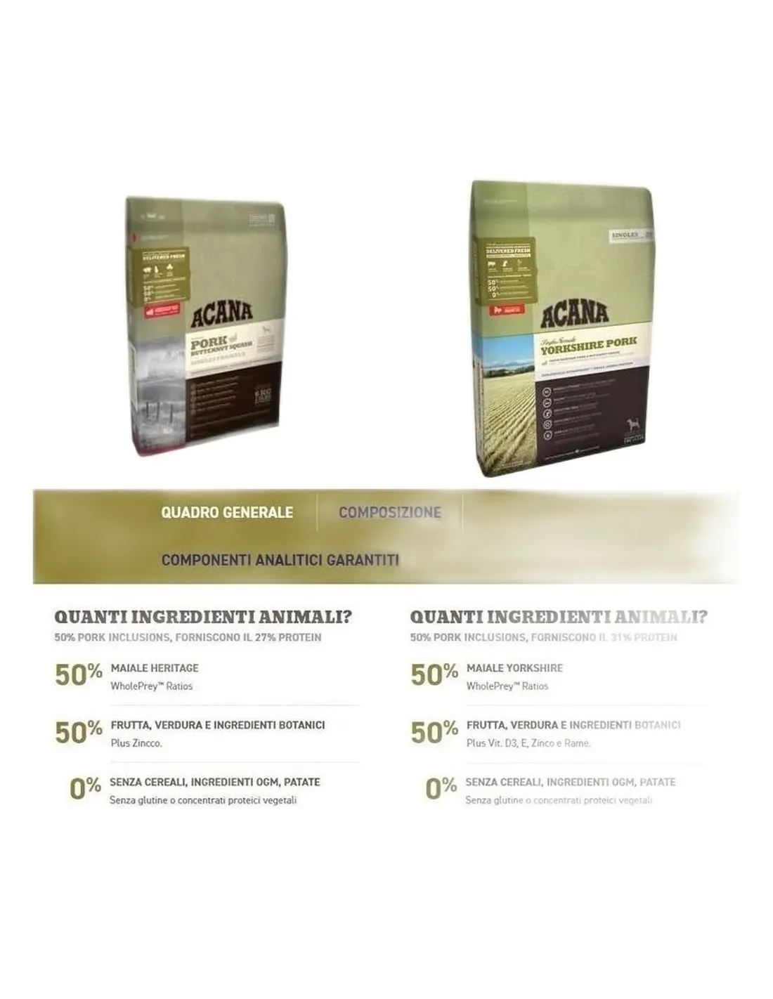 DLA WSZYSTKICH WYŚCIGÓW I ETAPÓW ŻYCIAACANA Yorkshire Pork to karma o ograniczonej liczbie składników, zawierająca w 50% wieprzowinę, jedno łatwo przyswajalne białko zwierzęce, dzięki czemu jest idealna dla psów z wrażliwością pokarmową każdej rasy i na każdym etapie życia.