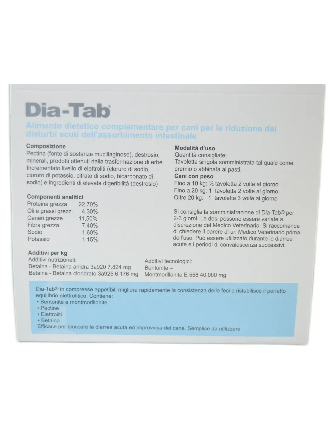 Tabletki Drn Dia-Tab zawierają pektynę, dekstrozę, minerały, produkty przetwórstwa ziołowego oraz podwyższony poziom elektrolitów. Każda tabletka waży 5 gramów. Opakowanie zawiera 60 tabletek.
