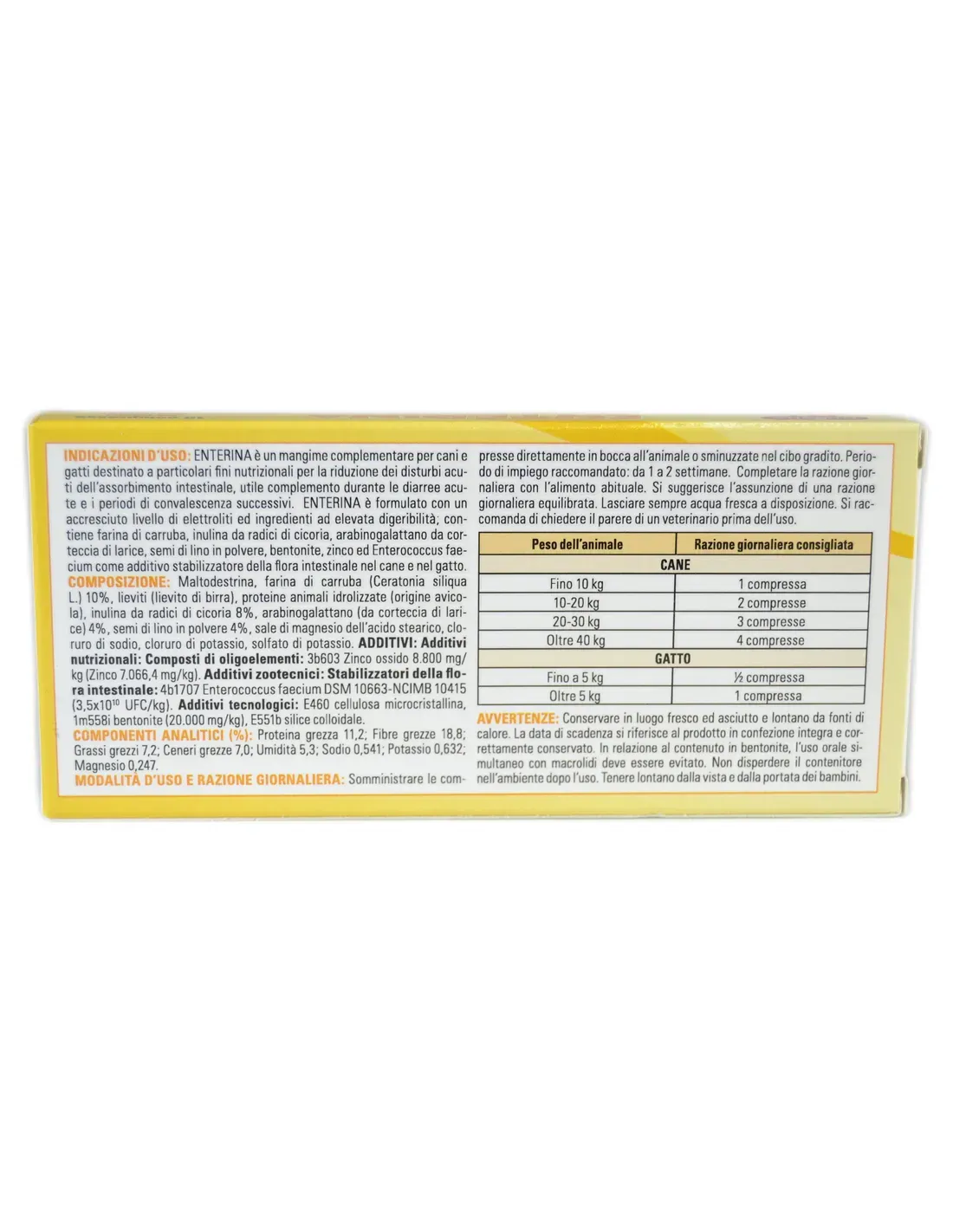 Enterina jest paszą uzupełniającą dla psów, przeznaczoną do szczególnych celów żywieniowych, w celu ograniczenia ostrych zaburzeń wchłaniania jelitowego, przydatną jako uzupełnienie podczas ostrej biegunki i późniejszych okresów rekonwalescencji. Enterina zawiera zwiększoną ilość elektrolitów i wysoce strawne składniki; zawiera mąkę chleba świętojańskiego, inulinę z korzeni cykorii, arabinogalaktan z kory modrzewia, sproszkowane siemię lniane, bentonit, cynk i Enterococcus faecium jako dodatek stabilizujący florę jelitową u psów.