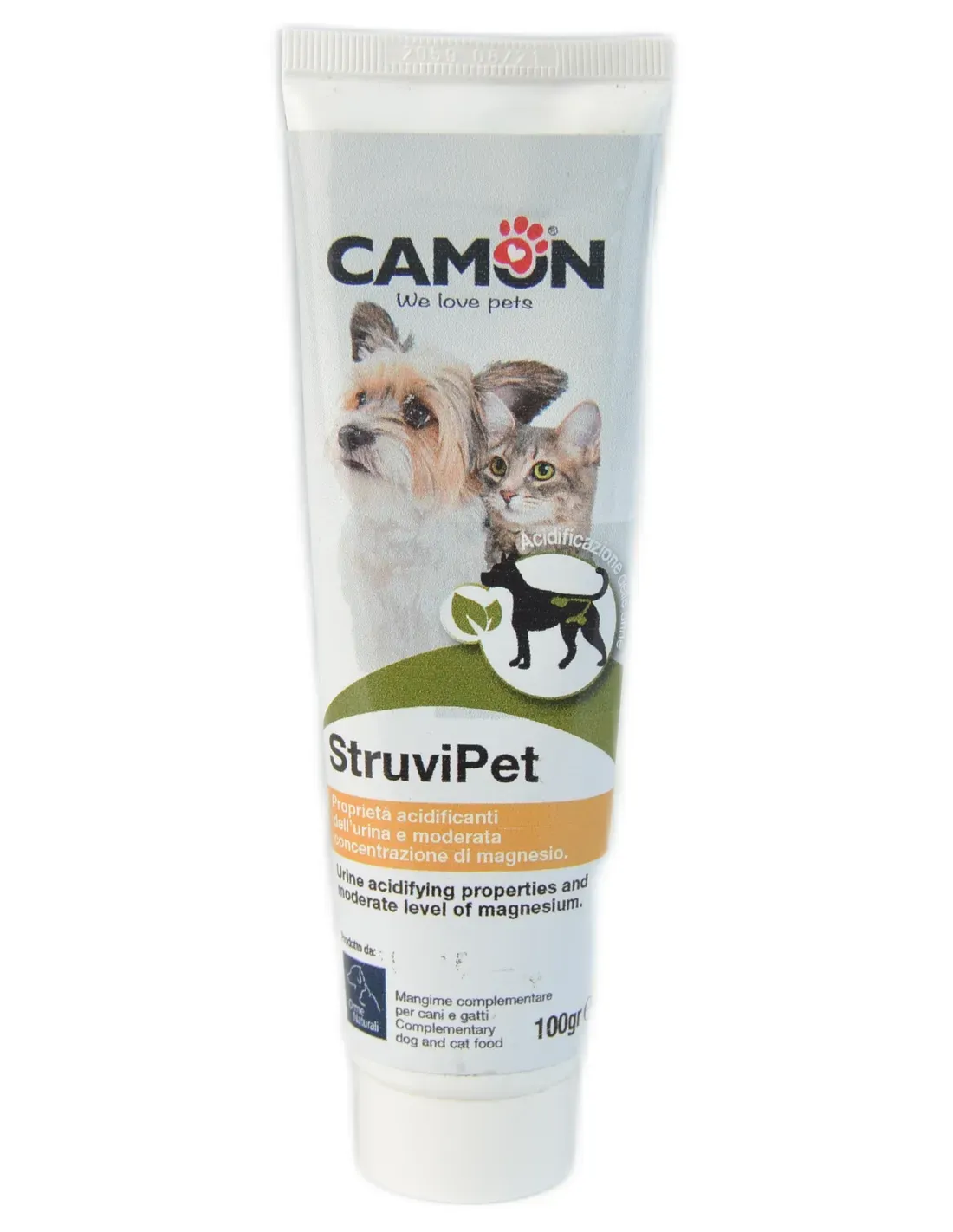 Struvipet Pasta Camon to suplement diety opracowany specjalnie do leczenia i zapobiegania tworzeniu się kryształów i kamieni moczowych u psów i kotów. Jest to smaczna pasta, która pomaga utrzymać równowagę pH moczu, ułatwiając w ten sposób rozpuszczanie kryształów struwitu i zapobiegając ich przyszłemu tworzeniu.