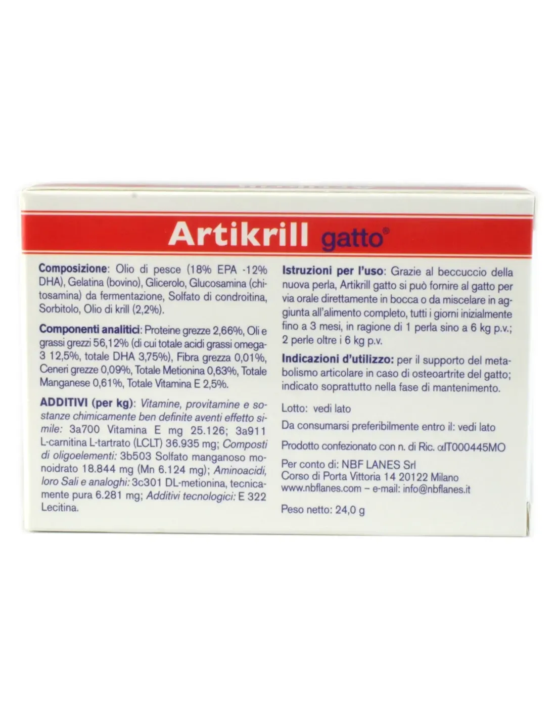 Perły Artikrill Gatto NBF zawierają zbilansowaną kombinację naturalnych składników aktywnych i składników odżywczych niezbędnych dla zdrowia stawów, w tym Omega-3, ekstrakty z kryla, witaminę E, glukozaminę, chondroitynę i określone minerały, które działają synergistycznie, wspierając regenerację i funkcjonalność chrząstki i stawów.