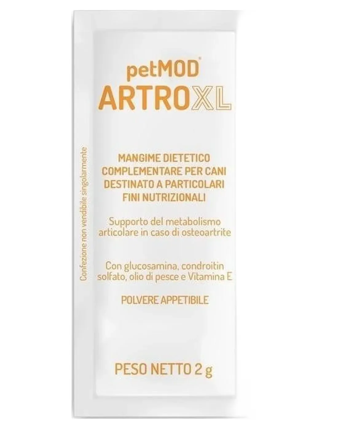 Odpowiedni dla zwierząt o wadze powyżej 25 kg, petMOD® ARTRO XL ma postać smacznego proszku z kwasami tłuszczowymi omega 3 z oleju rybnego, glukozaminą, siarczanem chondroityny, nukleotydami, petMOD®, mirrą, witaminą E, witaminą D3 oraz kurkumą i boswellią ekstrakty przydatne do promowania prawidłowego stanu stawów. petMOD® ARTRO XL występuje w wygodnych 2 gramowych saszetkach.