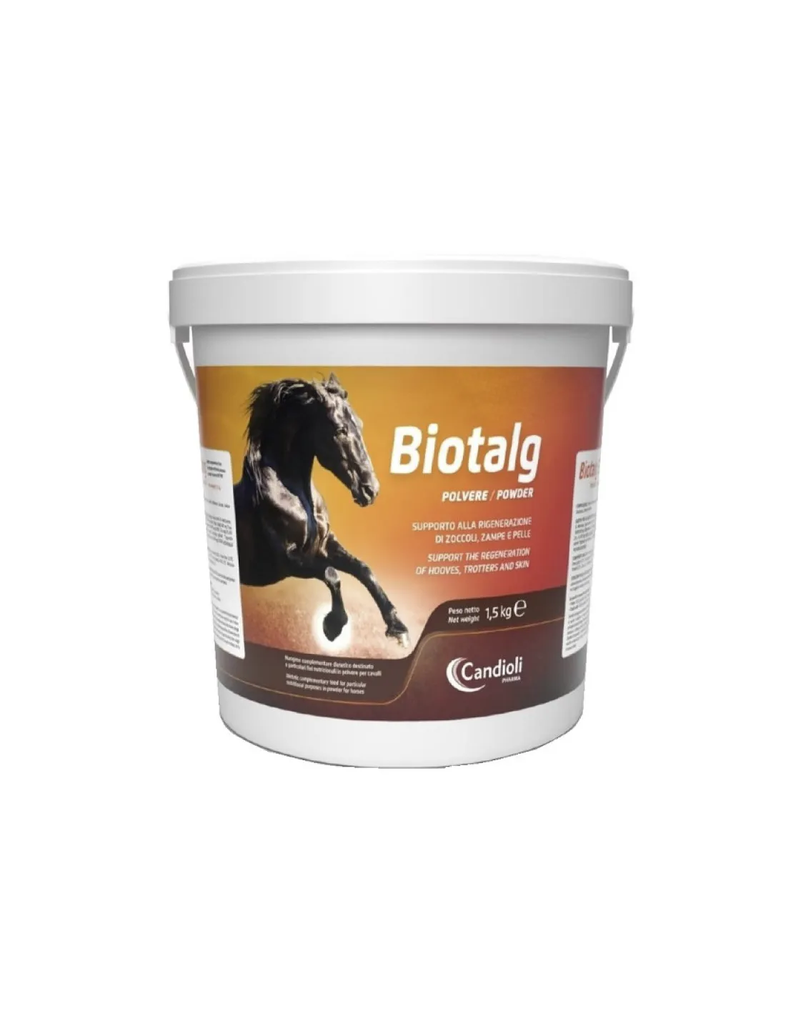 Biotalg dostarcza biotynę, która wspomaga równomierny wzrost paznokci. Ponadto jest bogata w pierwiastki śladowe, w szczególności miedź i cynk, przydatne w regeneracji substancji rogowej kopyt i przydatków skóry ( sierść, grzywa, ogon).