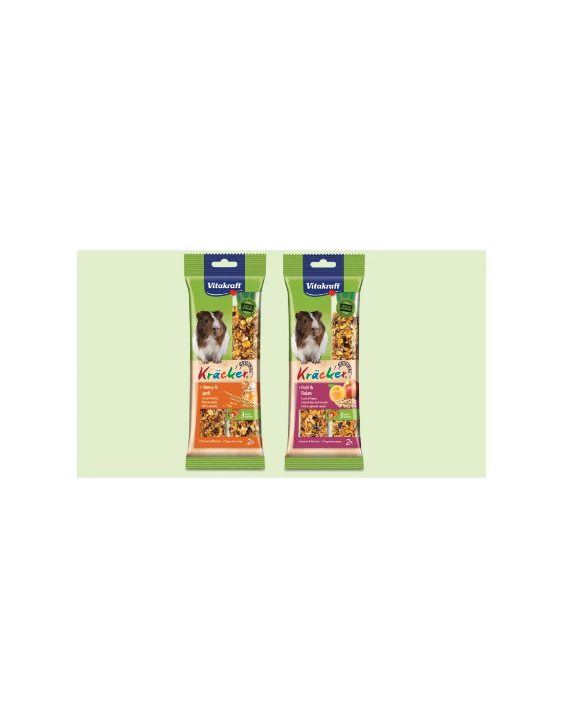 Kräcker® + miód i orkisz został specjalnie opracowany, aby zaspokoić potrzeby żywieniowe świnek morskich. Produkt pomaga w utrzymaniu zbilansowanej diety, wspierając zdrowie zębów dzięki konieczności gryzienia drewnianego patyka, co pomaga utrzymać zdrową długość zębów zwierzęcia.