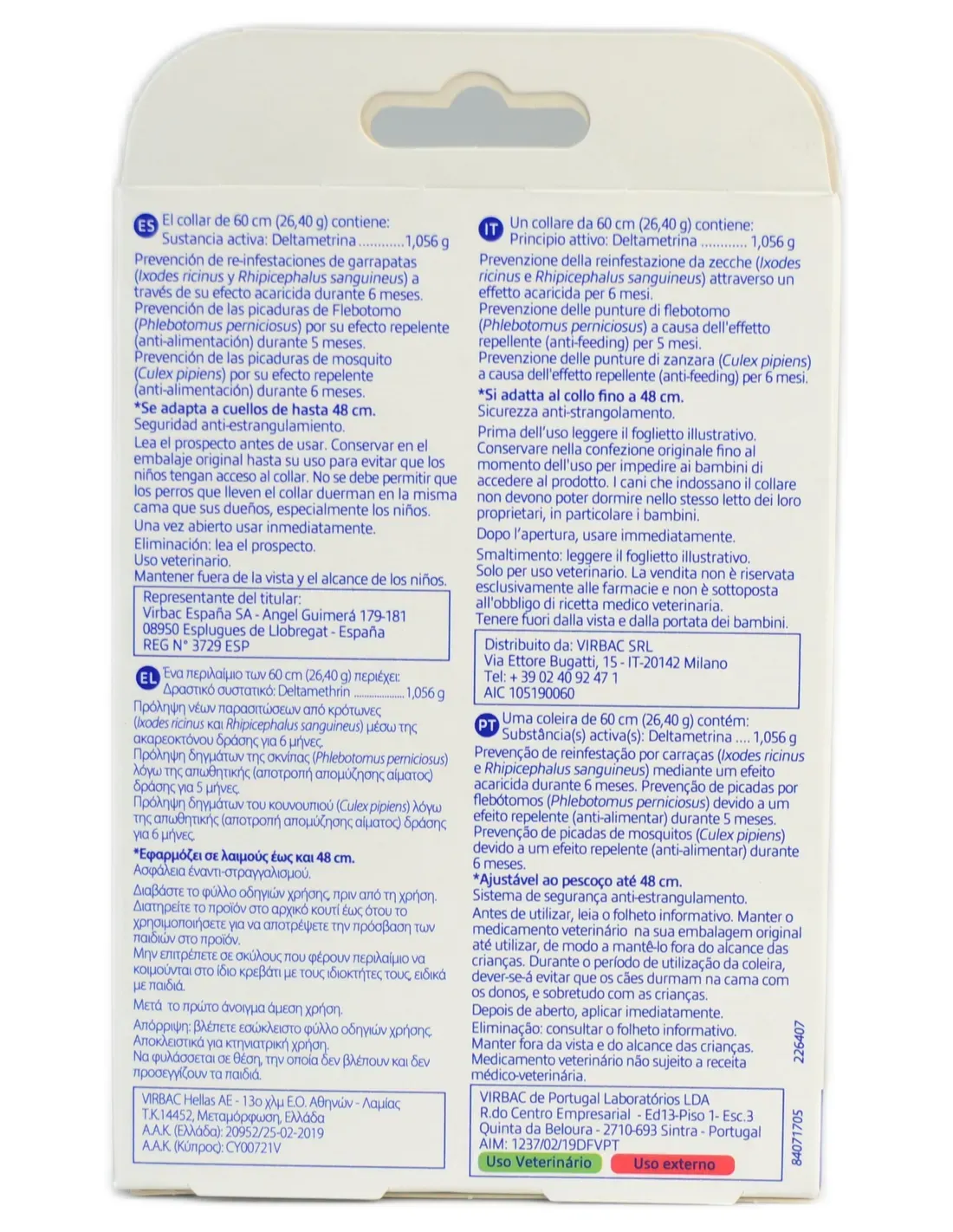 Zapobieganie ukąszeniom much piaskowych (Phlebotomus perniciosus) ze względu na działanie odstraszające (zapobiegające żerowaniu) przez 5 miesięcy. Zapobieganie ukąszeniom komarów (Culex pipiens) dzięki działaniu odstraszającemu (zapobiegającemu żerowaniu) przez 6 miesięcy.