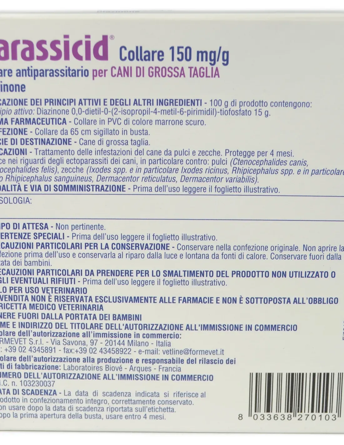 Jedna obroża na zwierzę. Pies: założenie obroży o długości 65 cm psom ras średnich/dużych (>20-45 kg) odpowiada dawce równej 2,20-1,03 mg diazynonu/kg masy ciała/dzień. Obroża, dzięki szczególnym właściwościom substancji czynnej, nie boi się wilgoci i nie traci aktywności w wodzie czy deszczu. Obroża gwarantuje ochronę aż do 4 miesięcy. Dalsze informacje znajdują się w ulotce dołączonej do opakowania.
